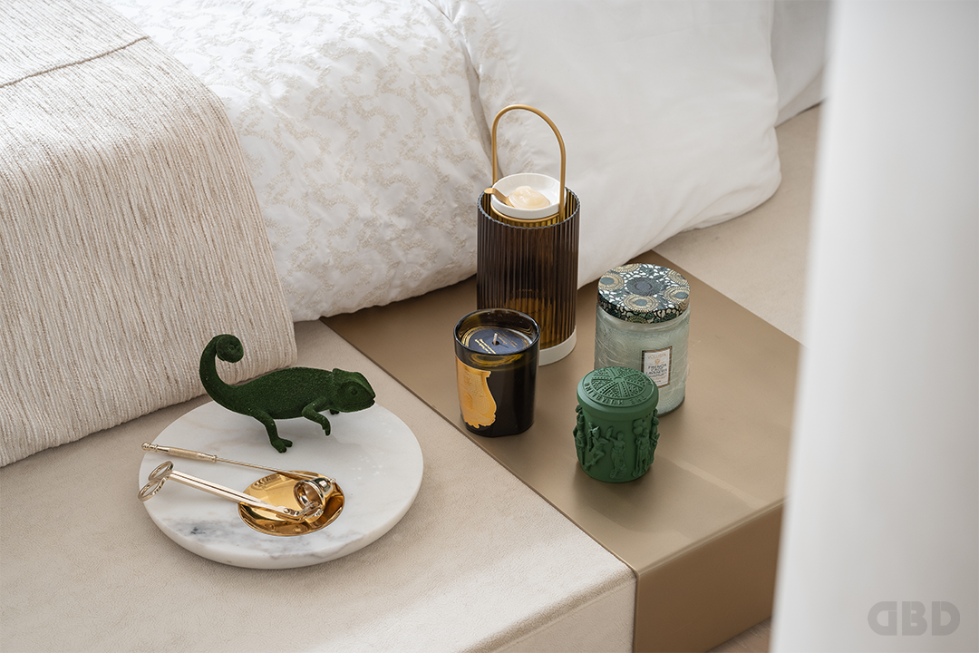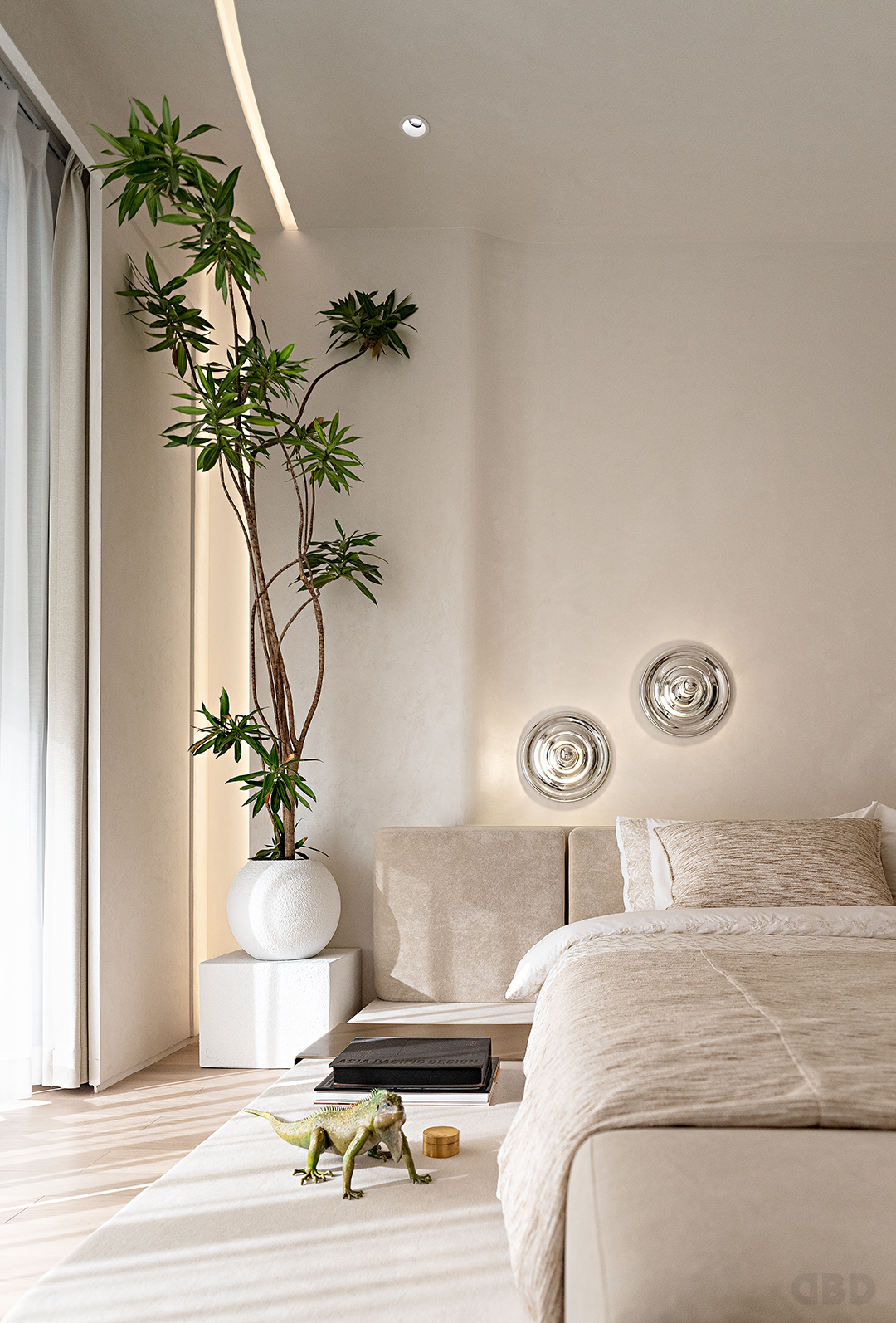 主卧营造出静谧安然的休憩之境。空间以大地色、米色为主色调,床边的绿植与蜥蜴将野外自然气息引入室内。在某个悠悠醒来的午后,坐在床榻边放空望着斜阳,独享着惬意的静谧时刻。