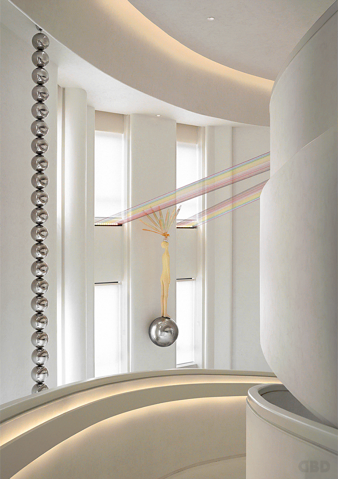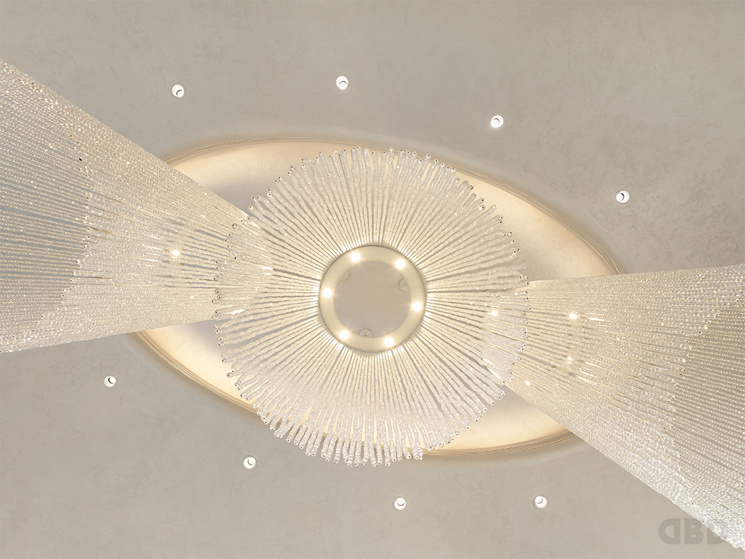 抬头看,天花的灯像一个个轻盈的水泡,表面以水纹形态蔓延,散射出剔透的光影,雕塑顶部的球体演化成一个顽皮的孩童,张开的双手延伸出轻快的趣味。
