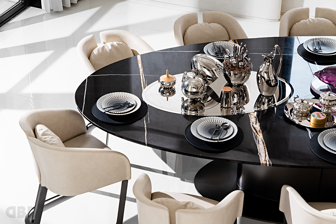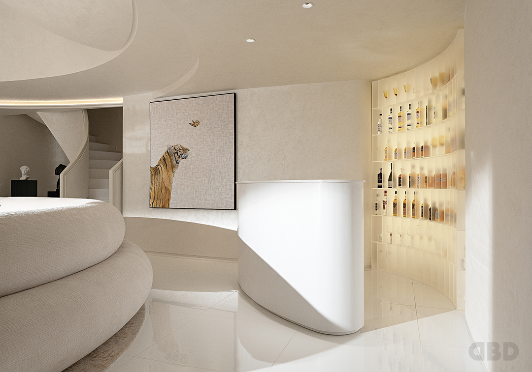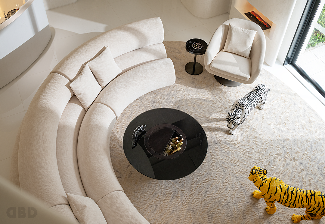 走进沙发区域,你也许会发现,脚下的地毯模拟着老虎皮毛的色泽与纹路。从酒柜中拿出威士忌,倒上一杯后放入面前的可开合式茶几中,点上雪茄,沉浸式独享片刻的休闲时光。
