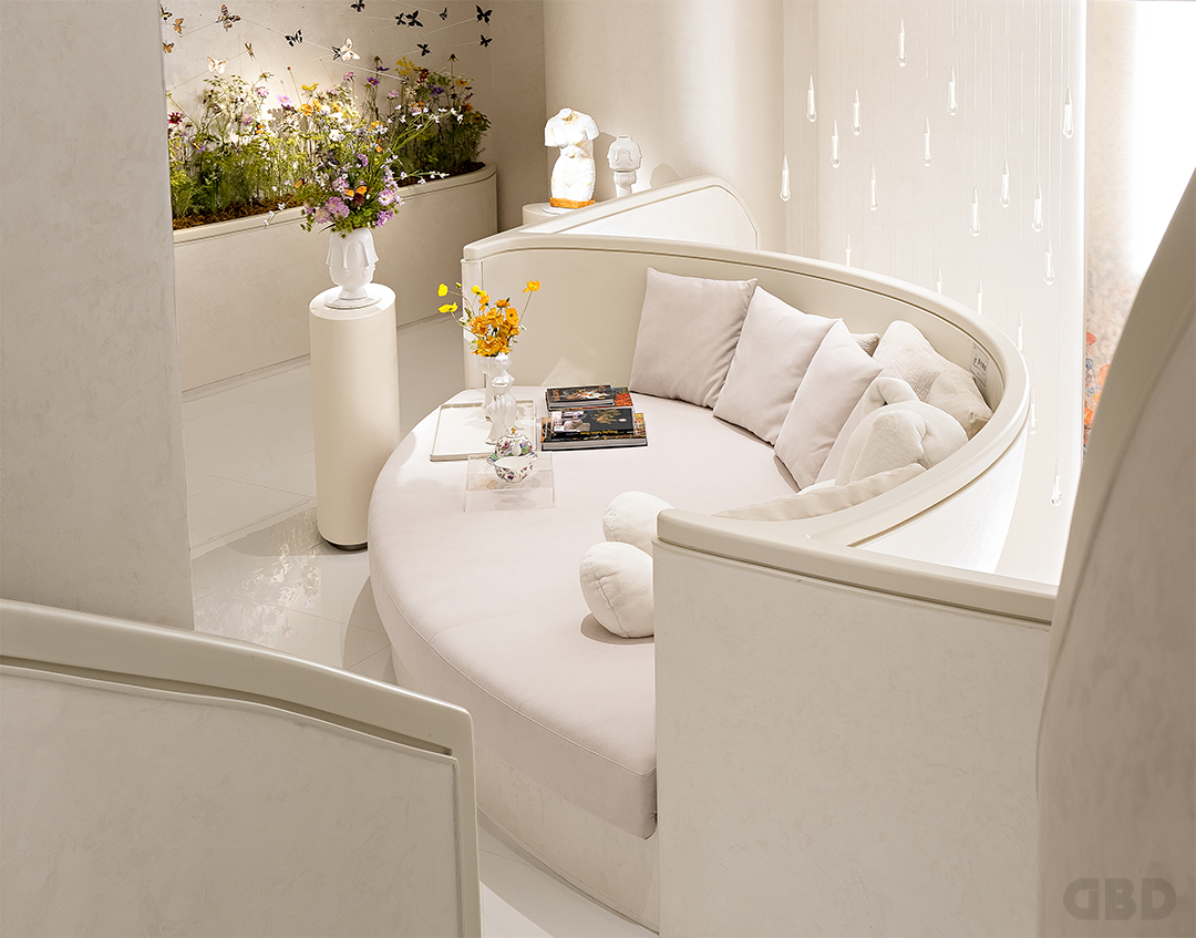 蝴蝶的飞行轨迹,指引我们来到了夹层的花艺区。沙发的弧度与建筑线条圆润呼应,一旁的墙面置入了成片的花艺绿植,蝴蝶装置萦绕其周遭,当亲友们一起插花时,可以在花丛中随意摘取灵感。