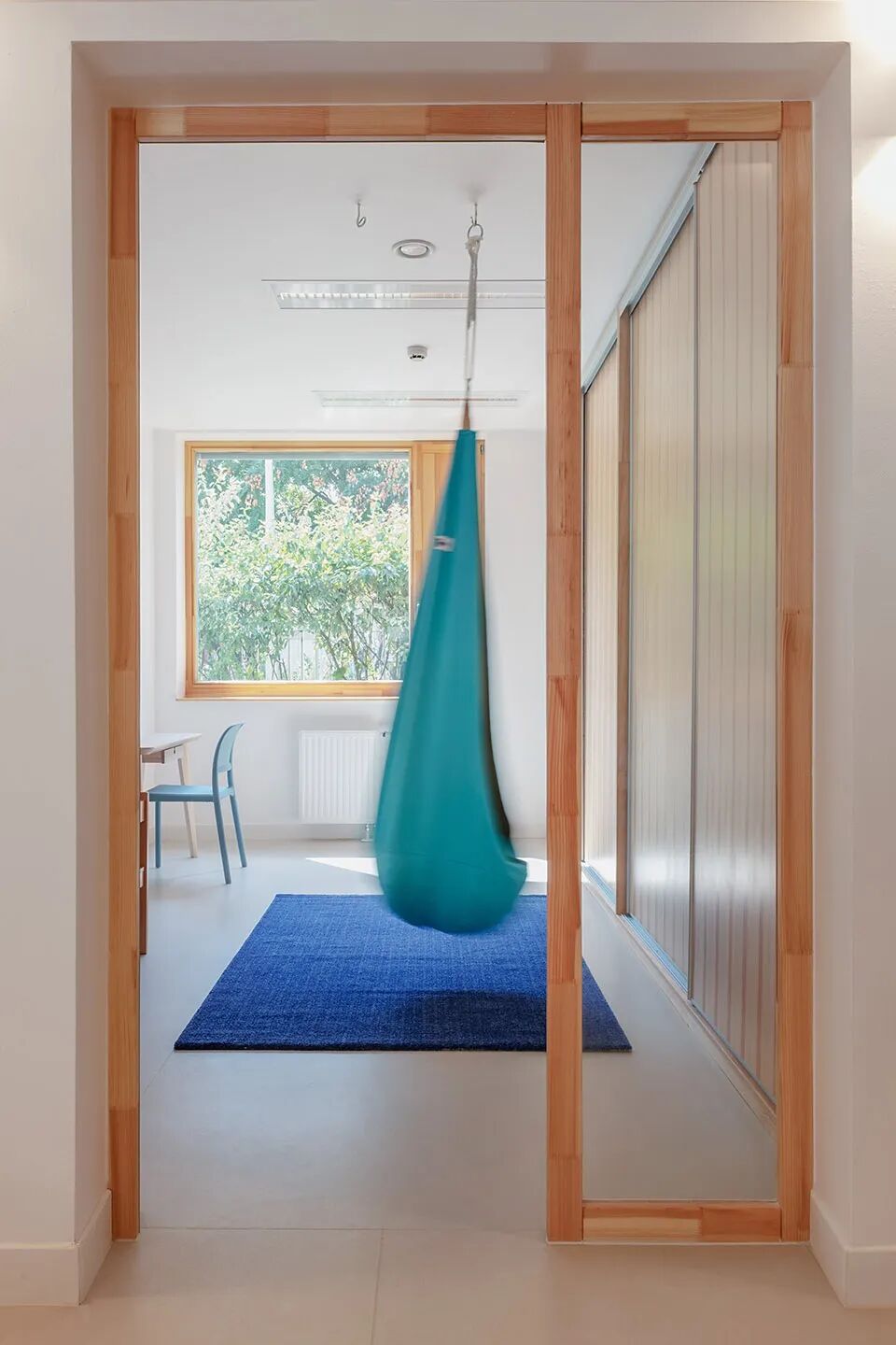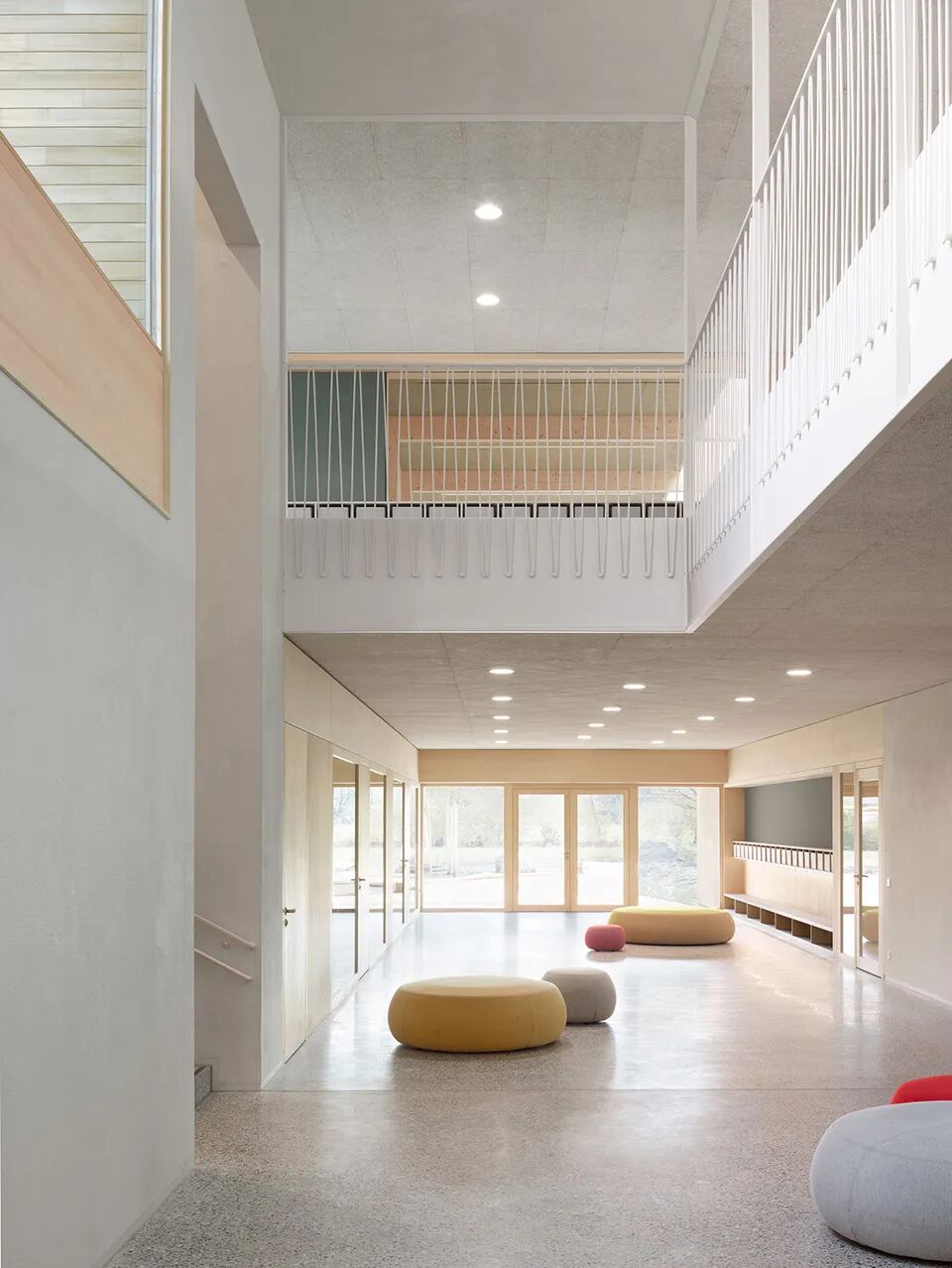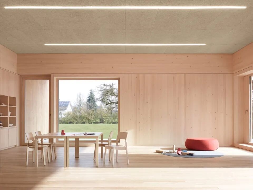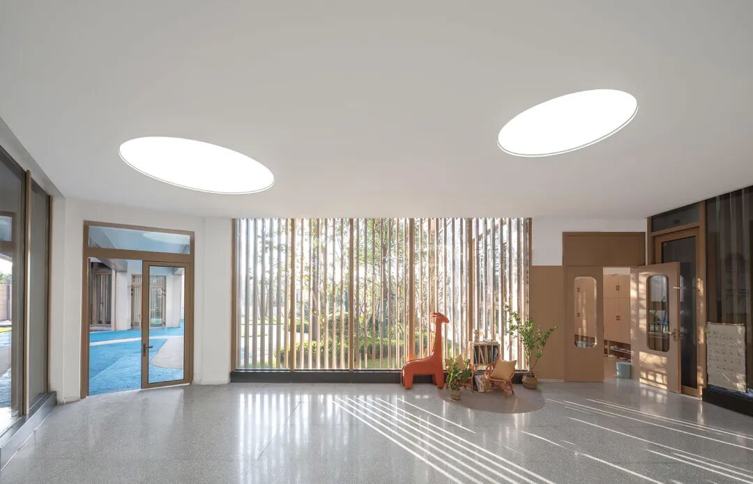 室内空间的材质避免了喧宾夺主,营造出欢快的氛围。实木表皮和石材材料在色彩方面精心调和,构成了丰富、有质感的室内环境,为儿童和教师们提供了一系列创造与想象的空间。