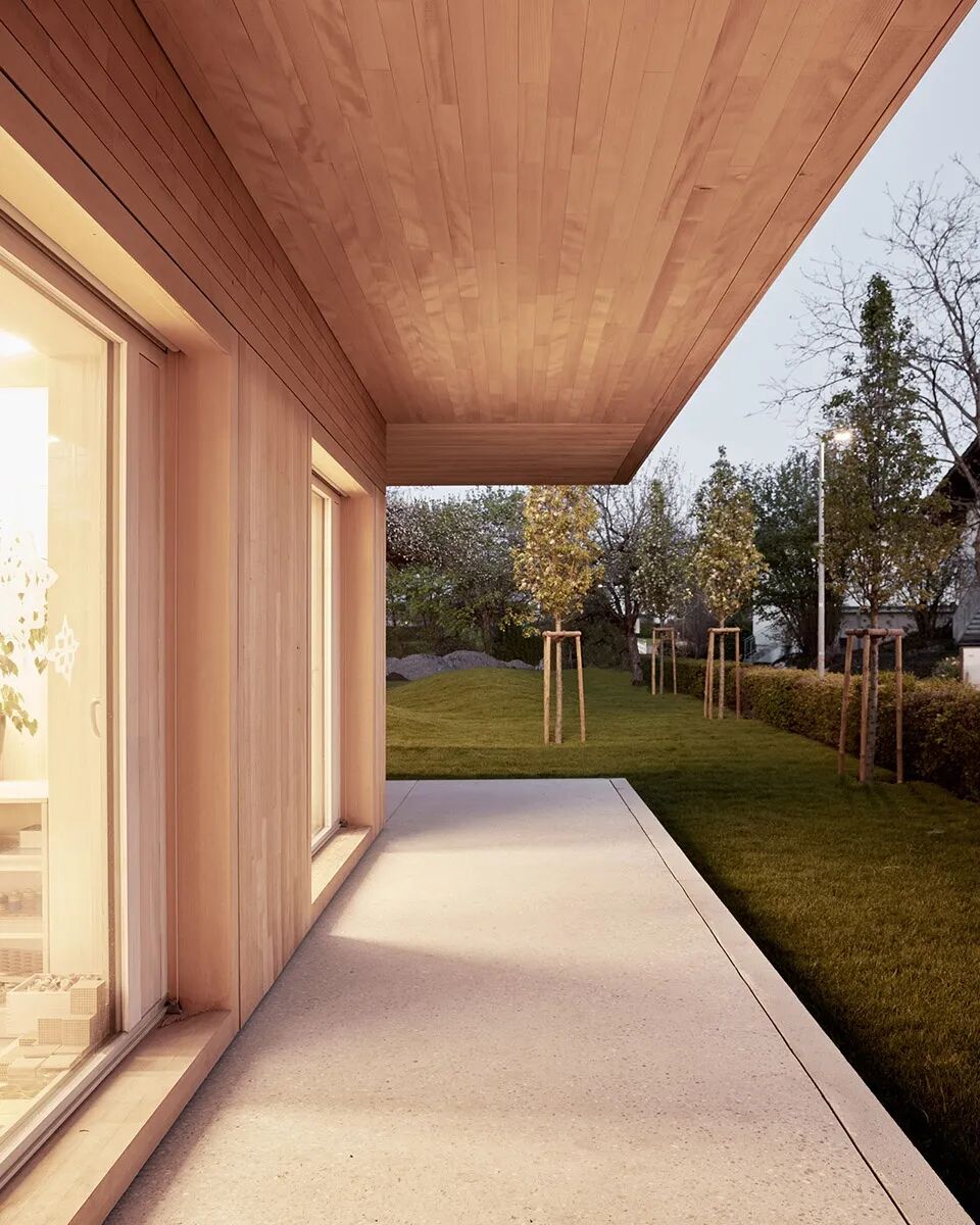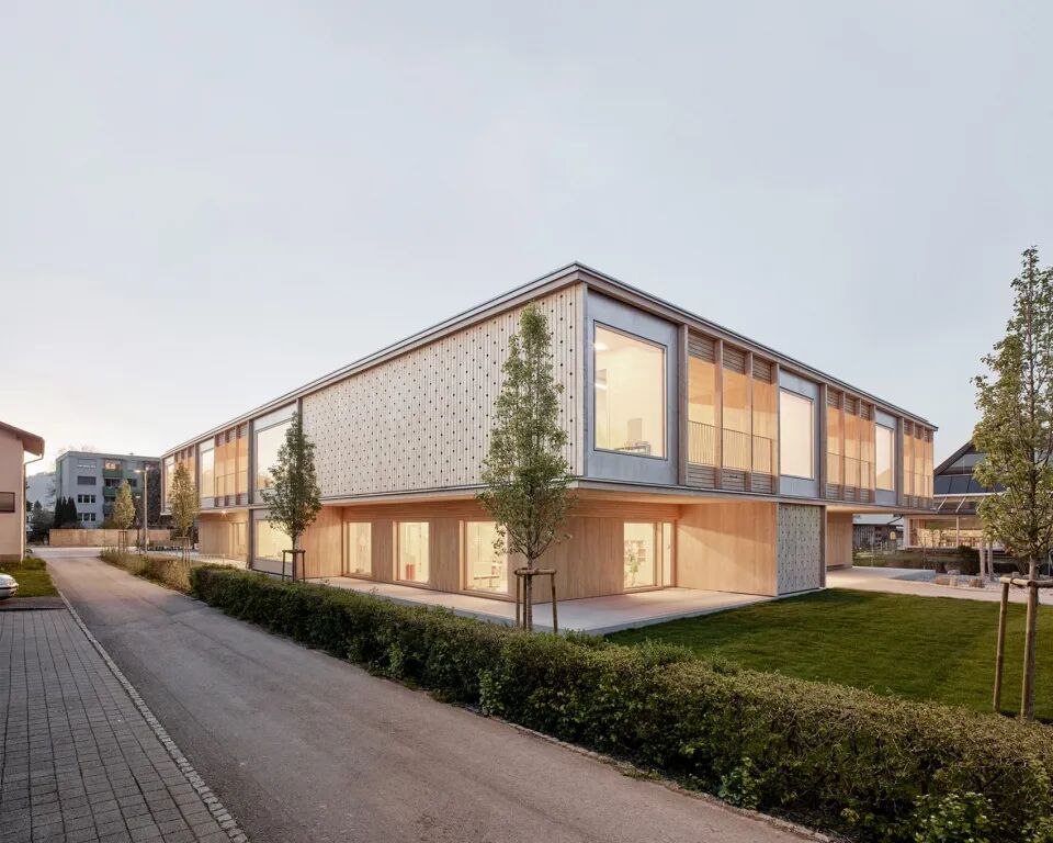 改造扩建后的建筑外观以大面积的开口、温暖的木制窗框与和谐活波的色调,与周围灰色的十层公寓楼形成鲜明的对比。在巧妙的设计下,建筑方正的体量感得到了弱化,为传统的住宅小区增添了一种新鲜的建筑风格。