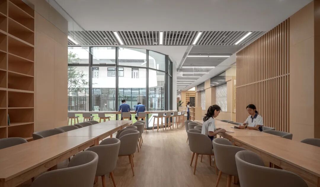 上海福山唐城外国语小学位于浦东新区玉盘北路、培德路路口。设计梳理归纳了教学与辅助空间,将食运楼、教学楼和办公楼环绕出一个巨大的共享空间,形成半围合式校园。