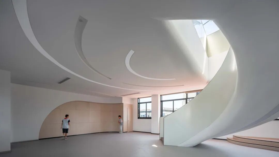 为了消解音体室上方的阶梯式活动平台的影响,建筑师顺应其走势,用柔和的曲面天花板在剖面上营造出“云朵”的意向,并结合点状分布的灯光,给空间营造了独特的童趣感。