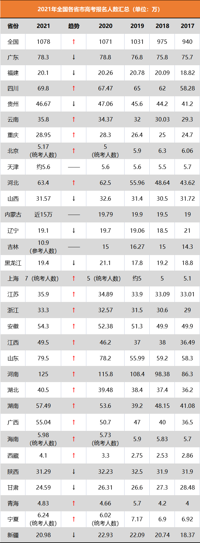 以2021的数据来看,河南近125万考生,山东广东近80万,四川约70万,河北湖南广西也都是50万+的级别,但西藏,青海等地高考人数不足5万。