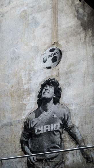 那不勒斯的每一面墙上都曾留下过马拉多纳的涂鸦,在小商店里,总是能见到马拉多纳的小塑像、纪念章、画像、十号球衣等,还有一家酒吧有一款名为“马拉多纳”的鸡尾酒,因为马拉多纳曾经光顾过……马拉多纳已经被凝练成了那不勒斯的城市名片,并且这道文化风景也将一直延续下去。