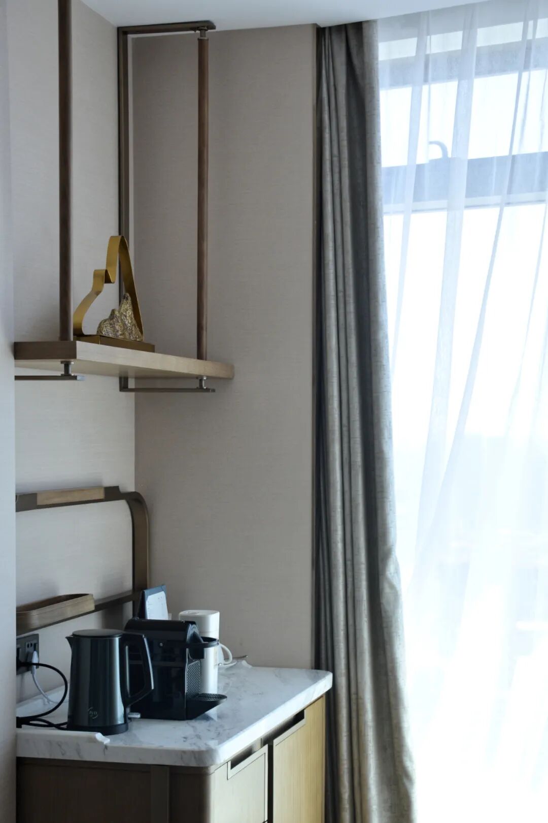 客厅里,角房的承重柱无法避免,但并未对视线造成很大影响。迷你吧和写字桌在窗边一左一右,都低调地将面积让渡,仅保留了最为简易的功能。