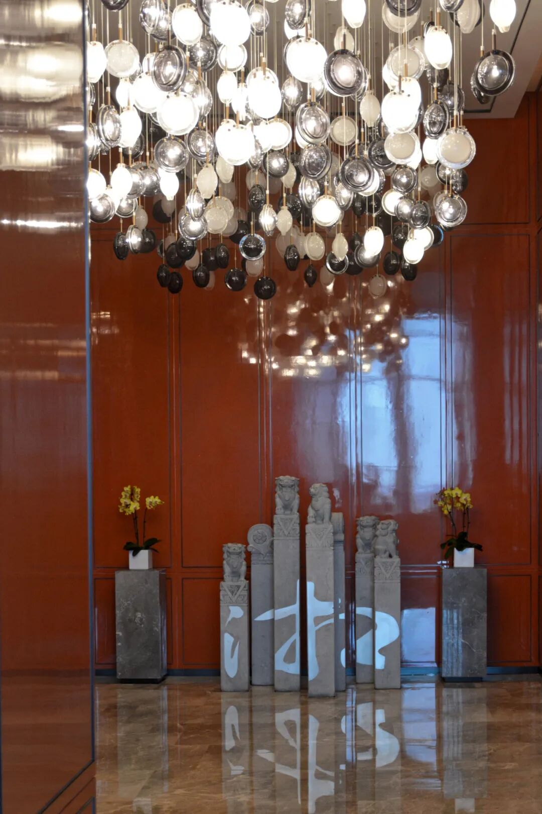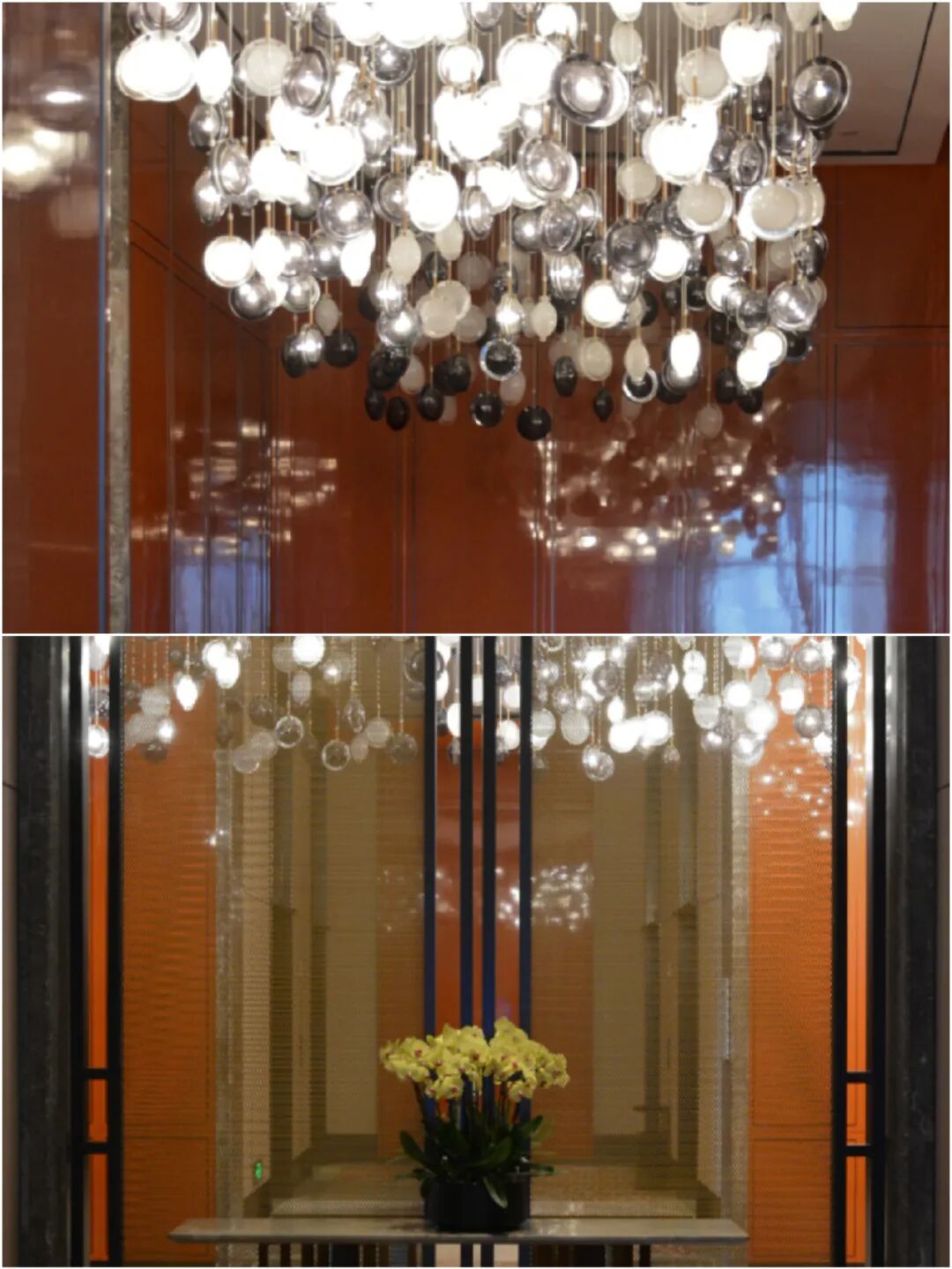 客房电梯入口处如星空般垂下的灯盏设计,显然是对长沙“星城”的致敬:长沙得名来自于星宿长沙星,“长沙小星,下应长沙。”