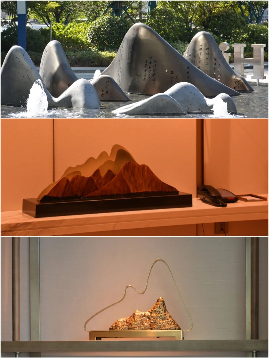 山形象的雕塑从酒店入口、客房楼层电梯出口、客房迷你吧柜子的上方,反复出现,让岳麓山这个极其强烈的在地化元素反复跃入眼前。