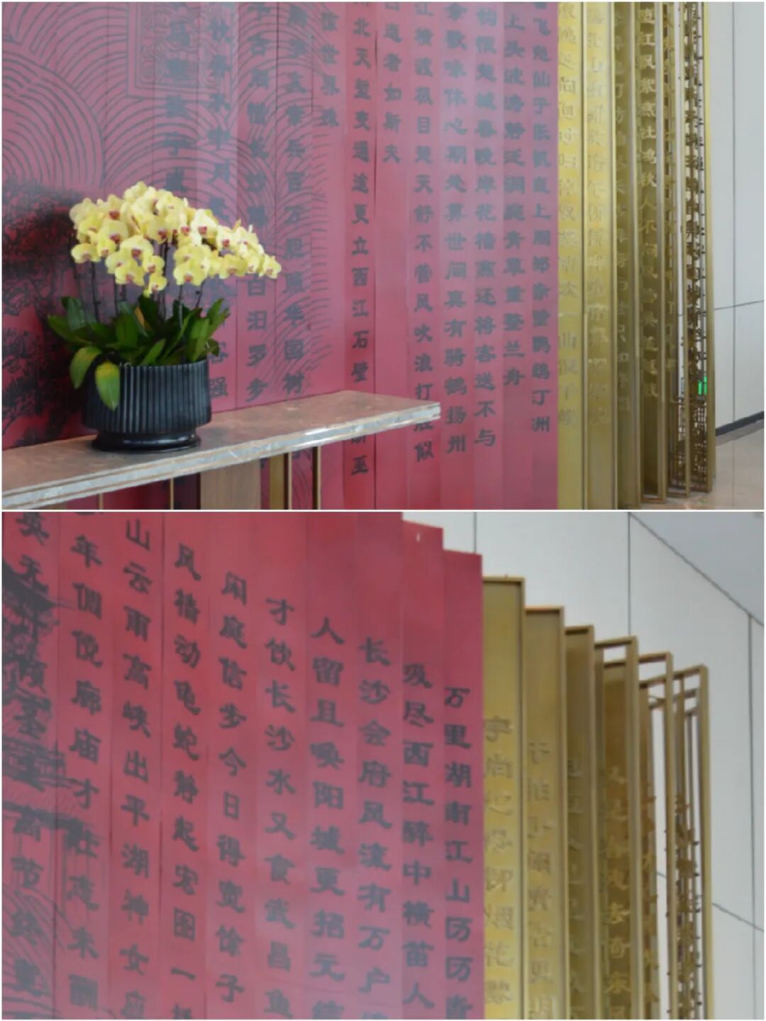 一处屏风,置于接待入住区域身后,叠叠开展的角度,是供办理入住的客人回头观赏用的。