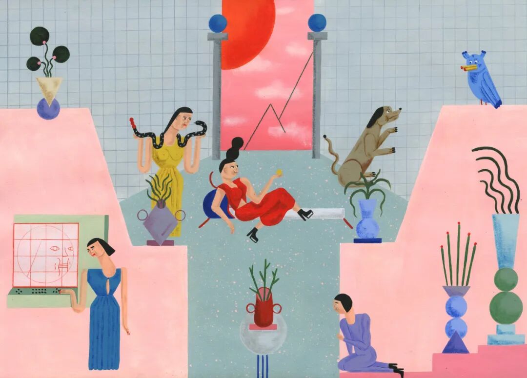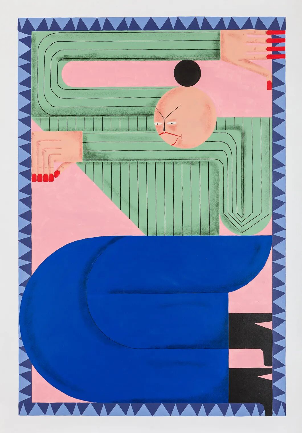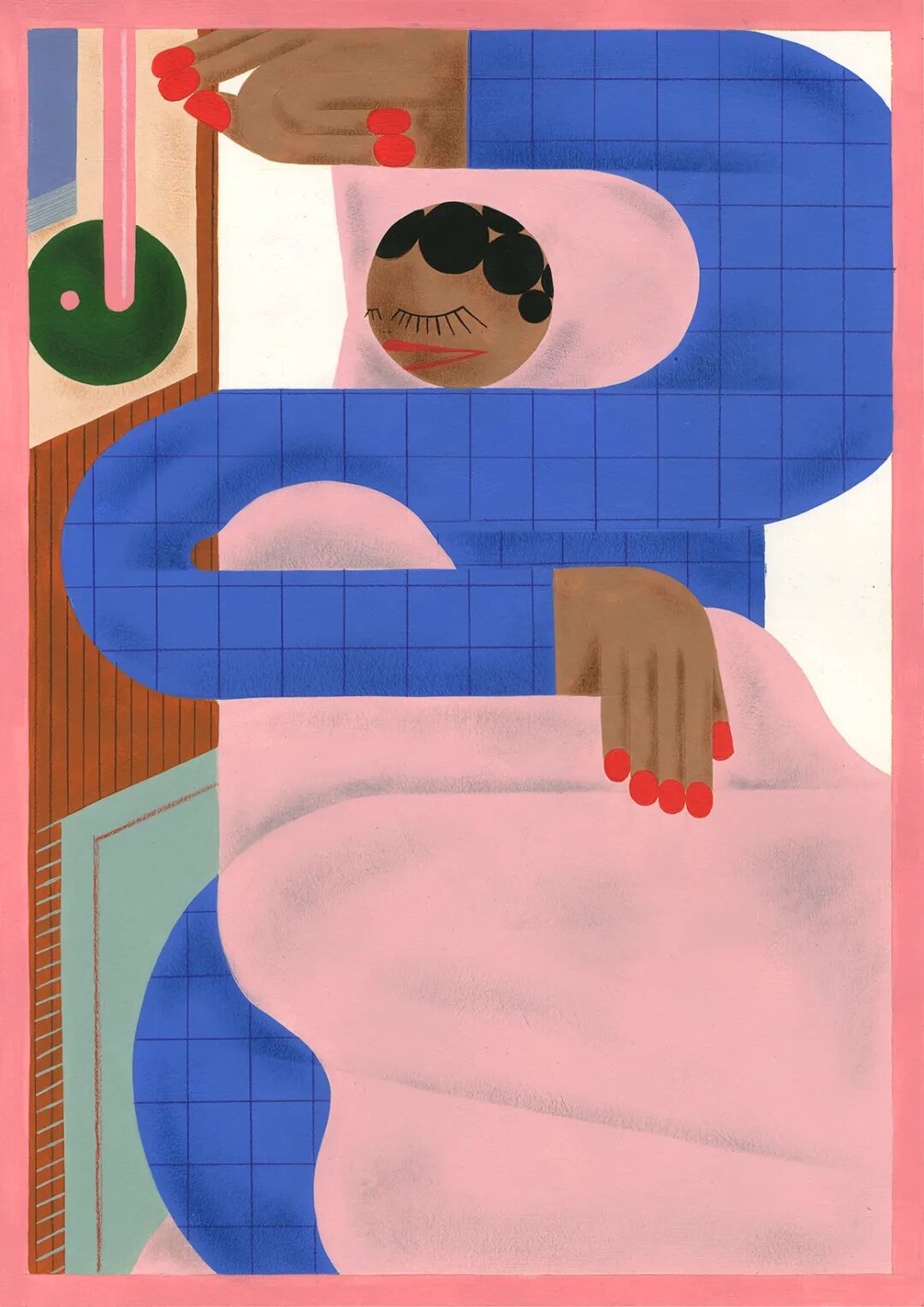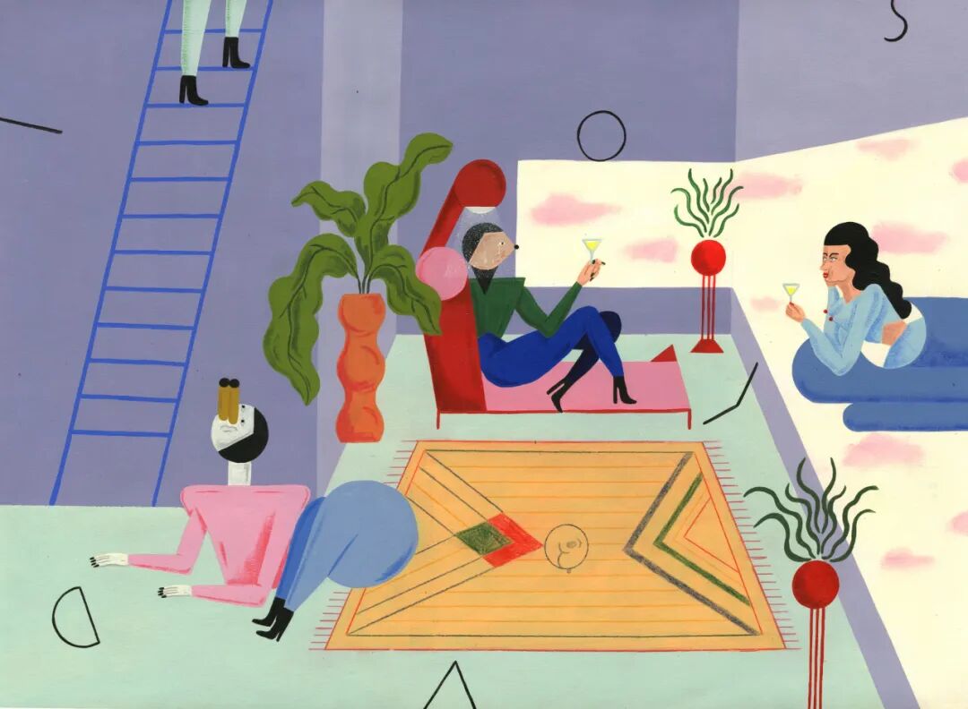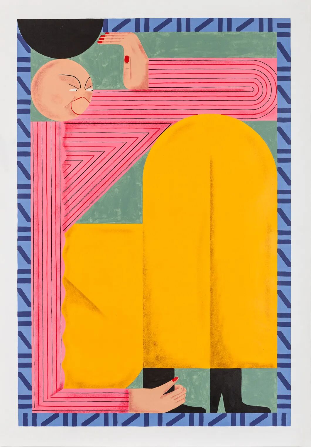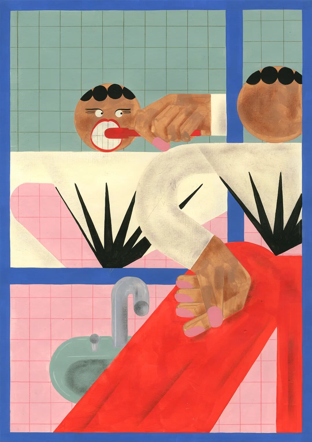 在 Stefhany 近期的作品中,她深受平面设计师和视觉艺术家 Camille Walala 影响,不管是电脑创作还是手绘,她的作品则更多倾向于使用几何线条和块面进行对象表达,与之前的作品相比,整体风格上并无强烈的割裂感和刷新感,更像是自热而然的延续,只是在很多作品中更能明显感觉到她在自我和特殊群体内心世界的表达欲望。