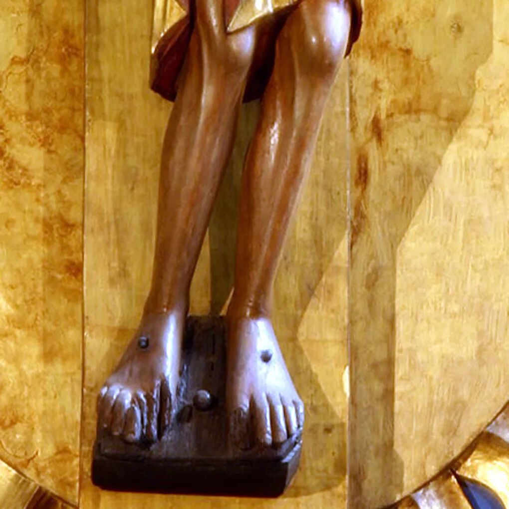 基督悬于十字架上,耗尽力气虚弱的双臂,含着极度痛苦表情的头部垂向右边,双膝带动身体扭向左边,双脚暗示已无法负荷自己生命力逐渐衰竭的身体重量。