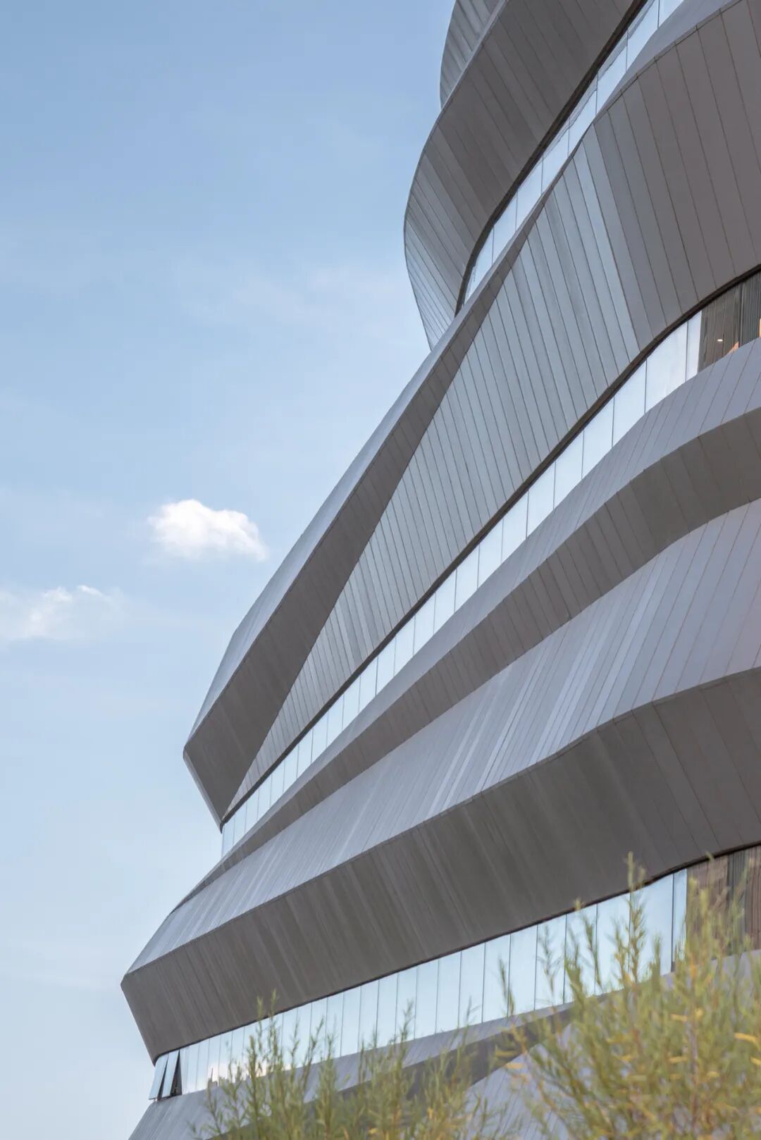 整座建筑以蜿蜒的造型设计,呈现出坚若磐石的外观,同时以中国西北地区自然地貌为启发,引入硬朗的水平线条,仿照触目可及的梯田造型,打造错落有致的层叠结构。
