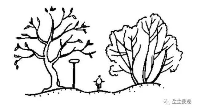 ▲群植以模拟自然状态,避免规则间距——或者一条线上排有两株以上的树。树距取决于树木类型和是否需要布置孤植的观赏树或枝叶茂密的庭荫树。