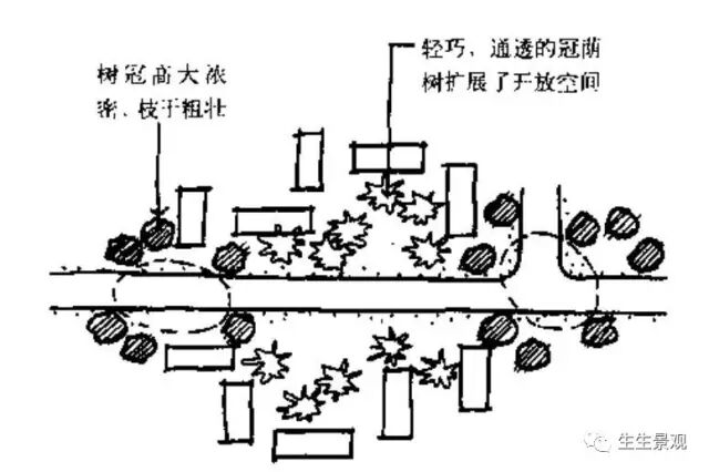 ▲中型树(与灌丛)是场所、平台及路线的限定者。利用它们来强化规划的线条和形式。