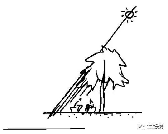 ② 选择的每一种植物应符合预期功能。有经验的设计师首先准备一张粗略的概念种植示意图来辅助决定详细的植物选择。这个示意图通常叠加在场地构筑物图纸上,在它上面分区分片地勾画出外形轮廓、箭头和描述种植实现目的的注记,例如: