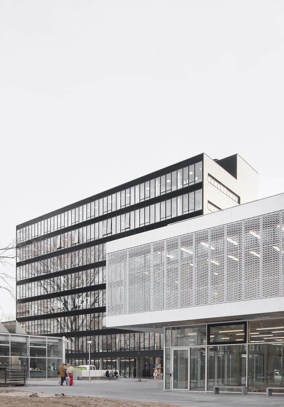 该学院楼作为一个社交中心,容纳了教学空间、聚会空间、放松空间和合作空间,同时将这些空间非常自然地联系在了一起,从而创造出一个极具灵活性的环境。