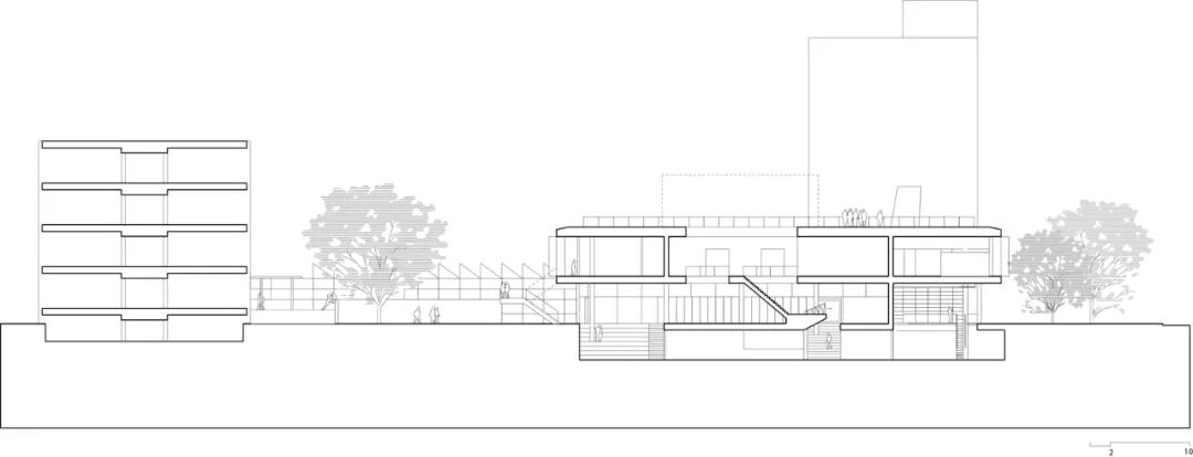 建筑外立面没有使用任何高科技技术,因此最大程度地降低了安装的难度。可折叠的网状钢材外表皮不仅实现了室内空间的自然通风,同时还配合着顶层的悬挑结构,避免了过多的光和热进入室内。而悬挑结构下方的空间作为一种过渡性空间,也为人们提供了户外的工作场所。