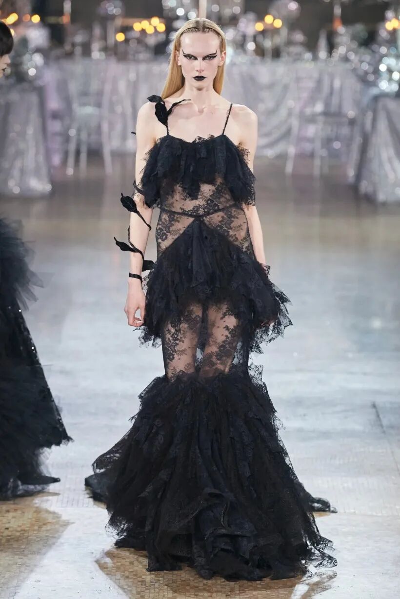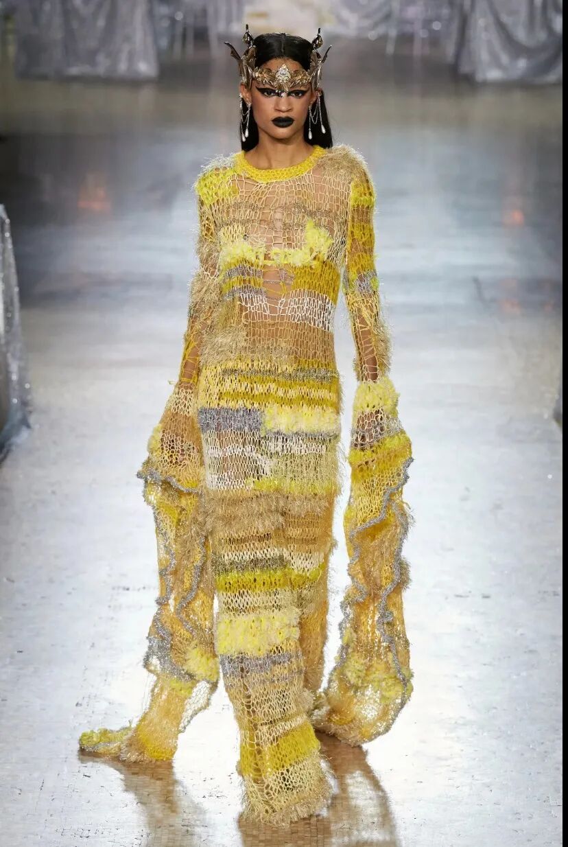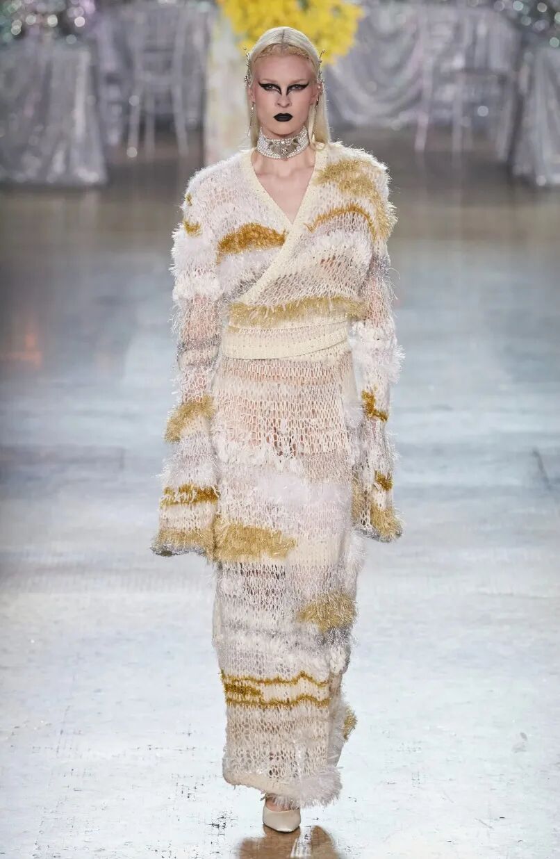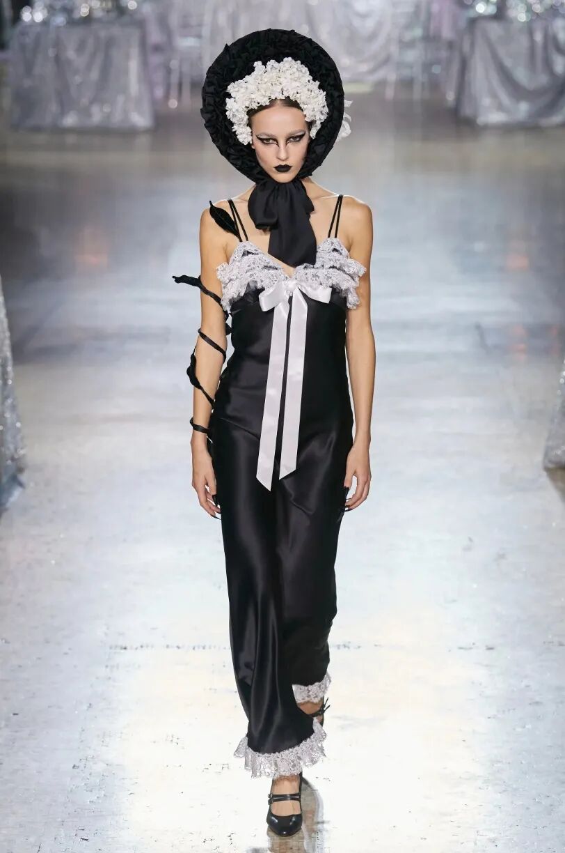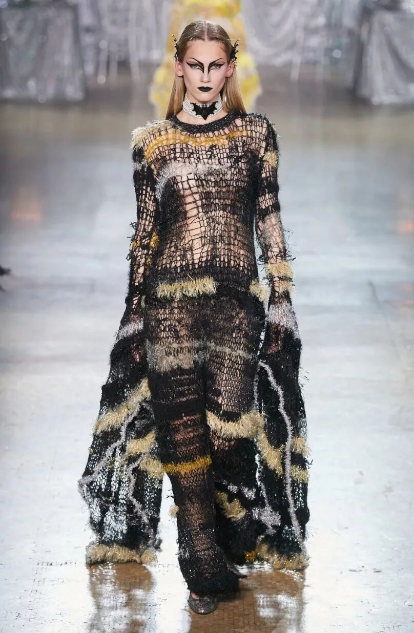 虽然Rodarte 2023秋冬系列设计师的灵感来自日本恐怖电影,设计中出现了蜘蛛网式针织衫、印有精灵、仙女图案的裙子,一种奇怪的浪漫产生了,缎面剪裁设计增加垂坠感,针织手法表现蜘蛛网连衣裙,华丽串珠配合袖口设计,在原本复古浪漫的气息上多了邪魅暗黑气息。