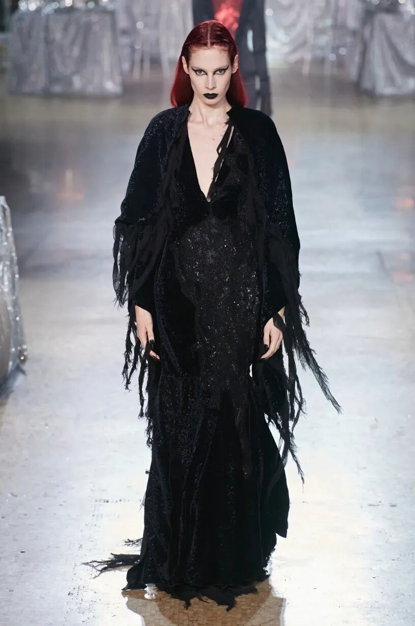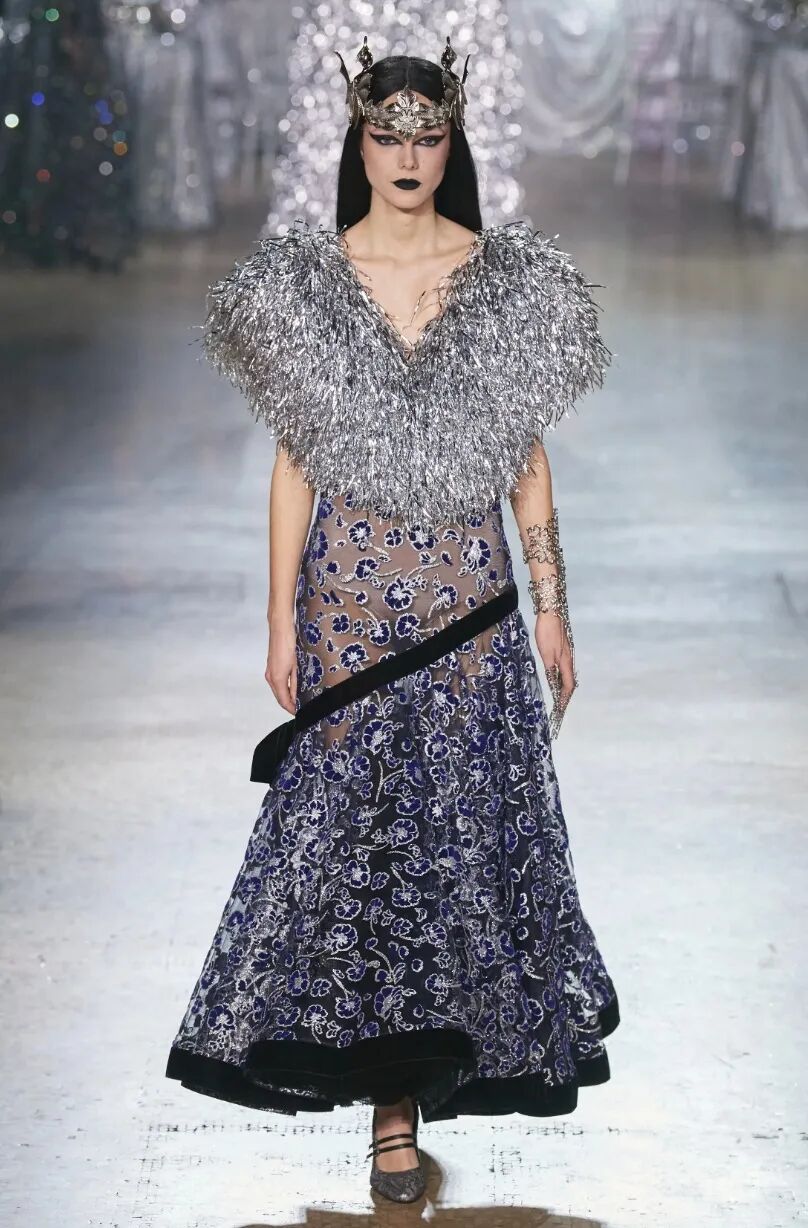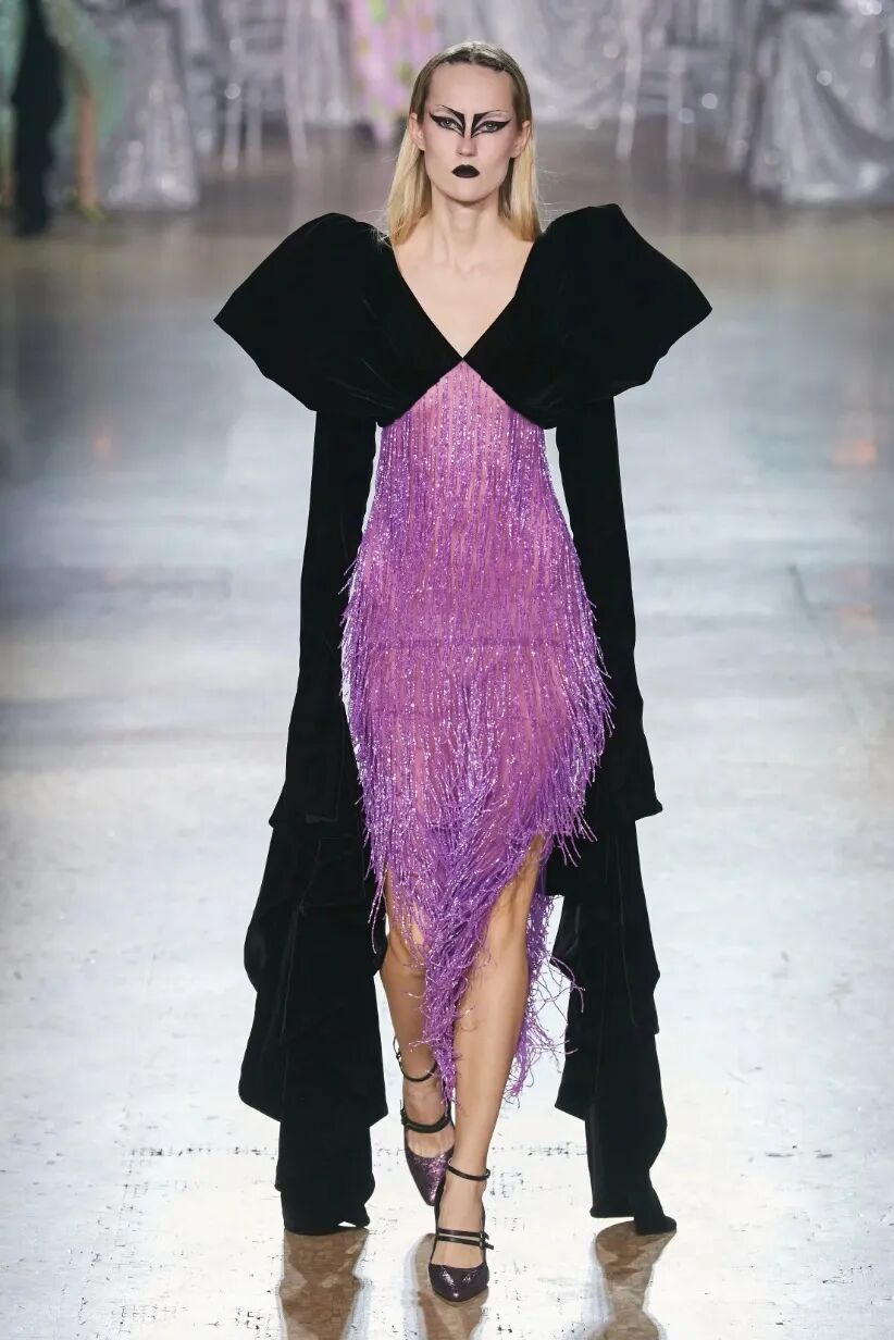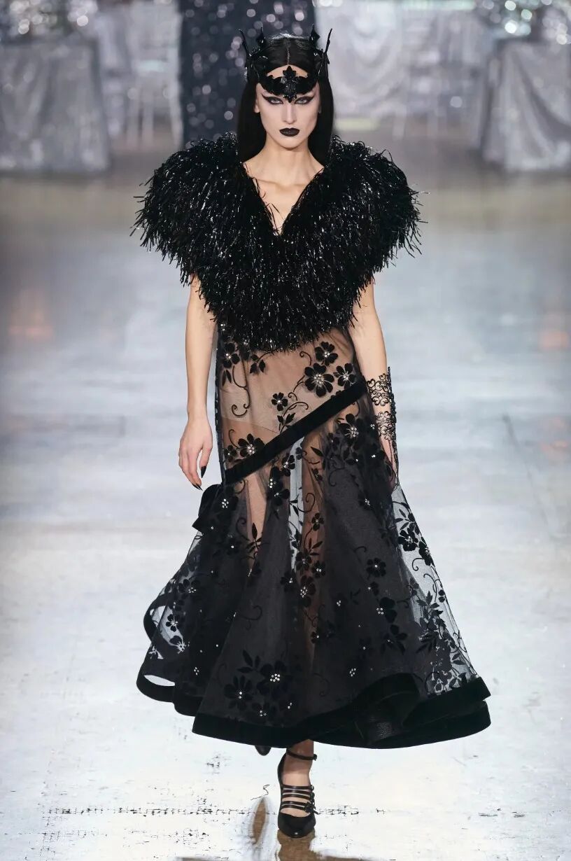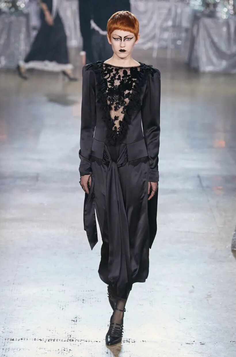 虽然Rodarte 2023秋冬系列设计师的灵感来自日本恐怖电影,设计中出现了蜘蛛网式针织衫、印有精灵、仙女图案的裙子,一种奇怪的浪漫产生了,缎面剪裁设计增加垂坠感,针织手法表现蜘蛛网连衣裙,华丽串珠配合袖口设计,在原本复古浪漫的气息上多了邪魅暗黑气息。
