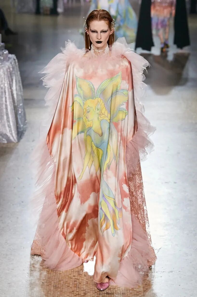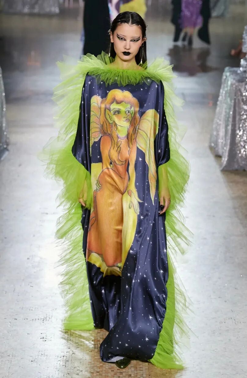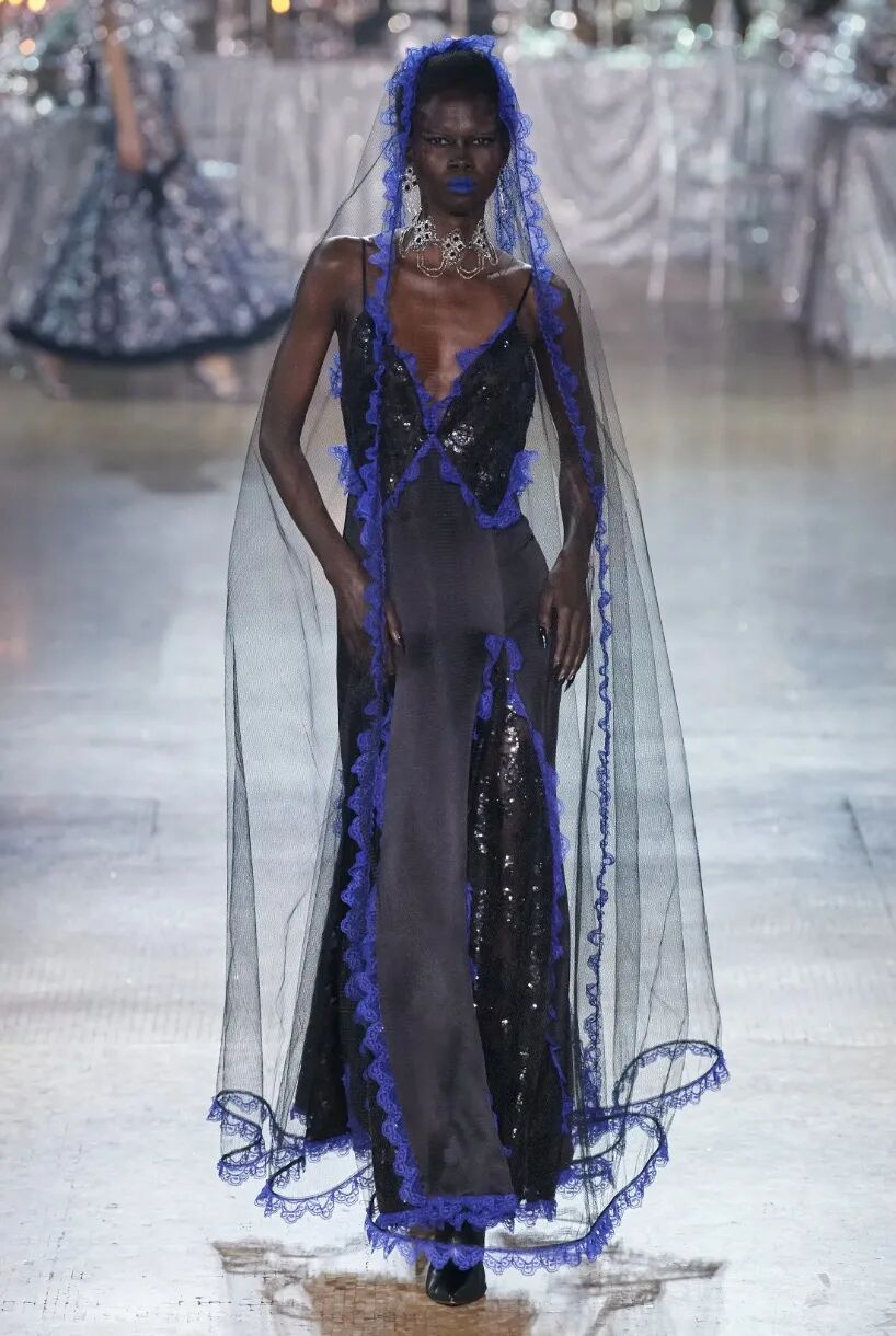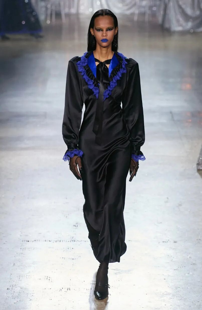 虽然Rodarte 2023秋冬系列设计师的灵感来自日本恐怖电影,设计中出现了蜘蛛网式针织衫、印有精灵、仙女图案的裙子,一种奇怪的浪漫产生了,缎面剪裁设计增加垂坠感,针织手法表现蜘蛛网连衣裙,华丽串珠配合袖口设计,在原本复古浪漫的气息上多了邪魅暗黑气息。