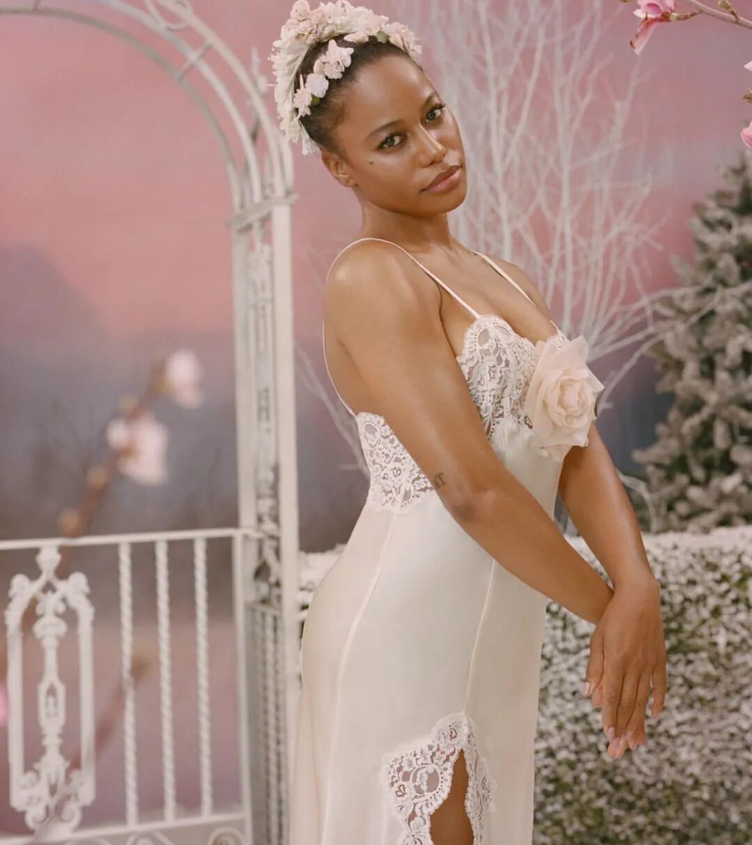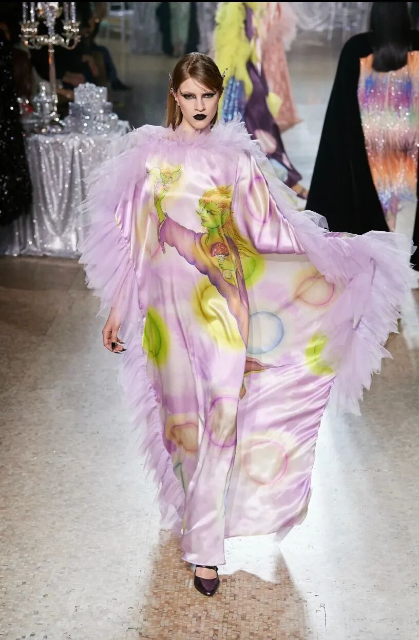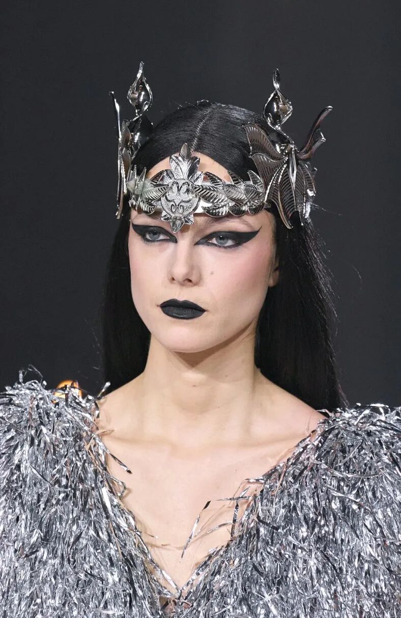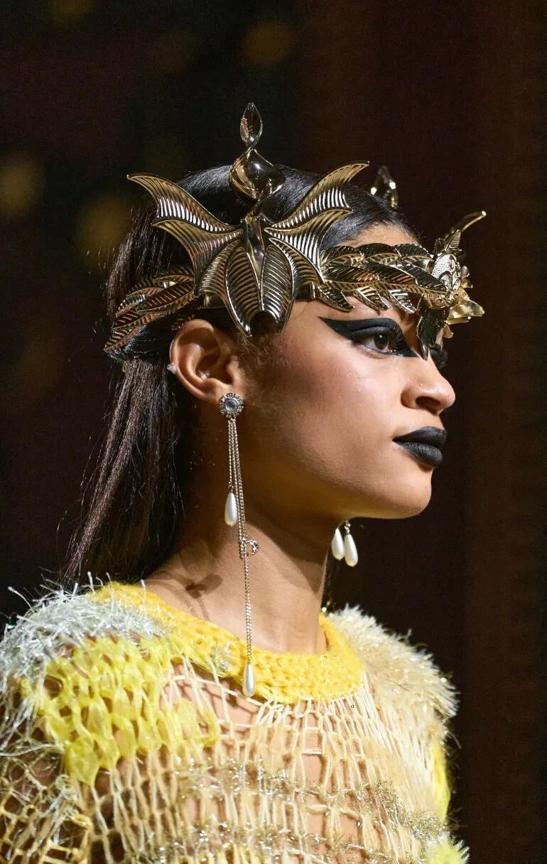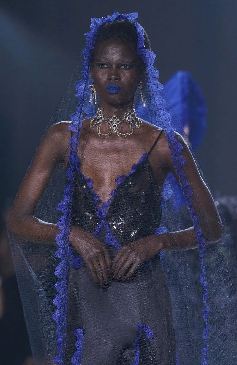 虽然Rodarte 2023秋冬系列设计师的灵感来自日本恐怖电影,设计中出现了蜘蛛网式针织衫、印有精灵、仙女图案的裙子,一种奇怪的浪漫产生了,缎面剪裁设计增加垂坠感,针织手法表现蜘蛛网连衣裙,华丽串珠配合袖口设计,在原本复古浪漫的气息上多了邪魅暗黑气息。