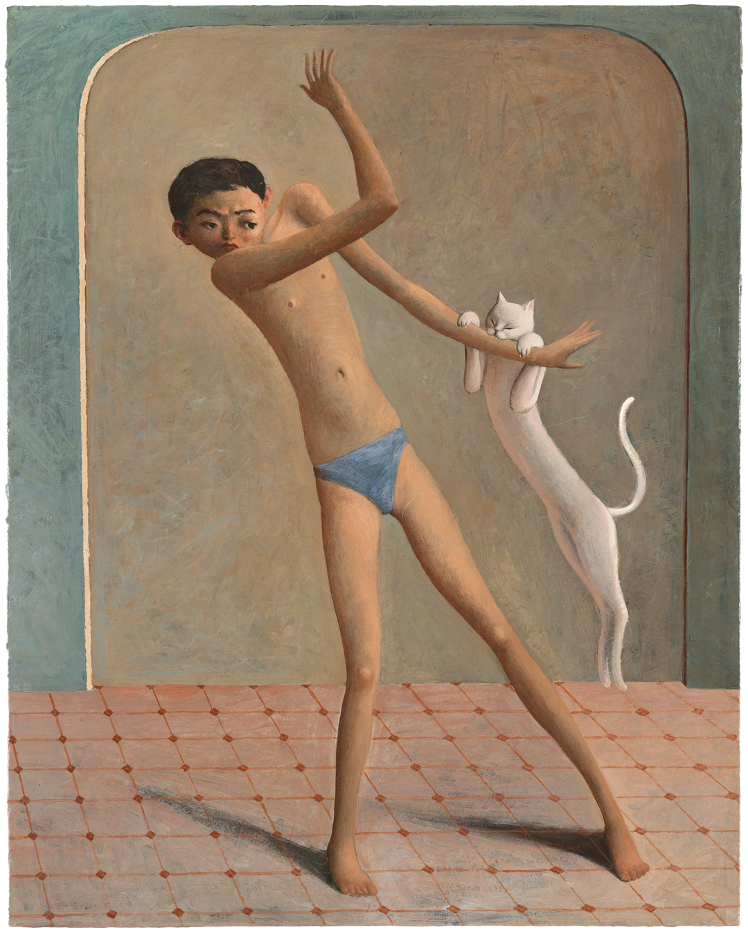 颜秉卿 男孩与白猫 2022 木板坦培拉 54×43cm