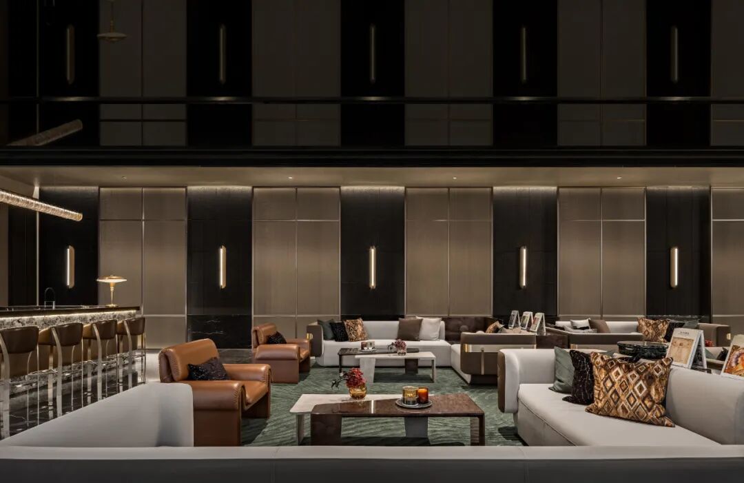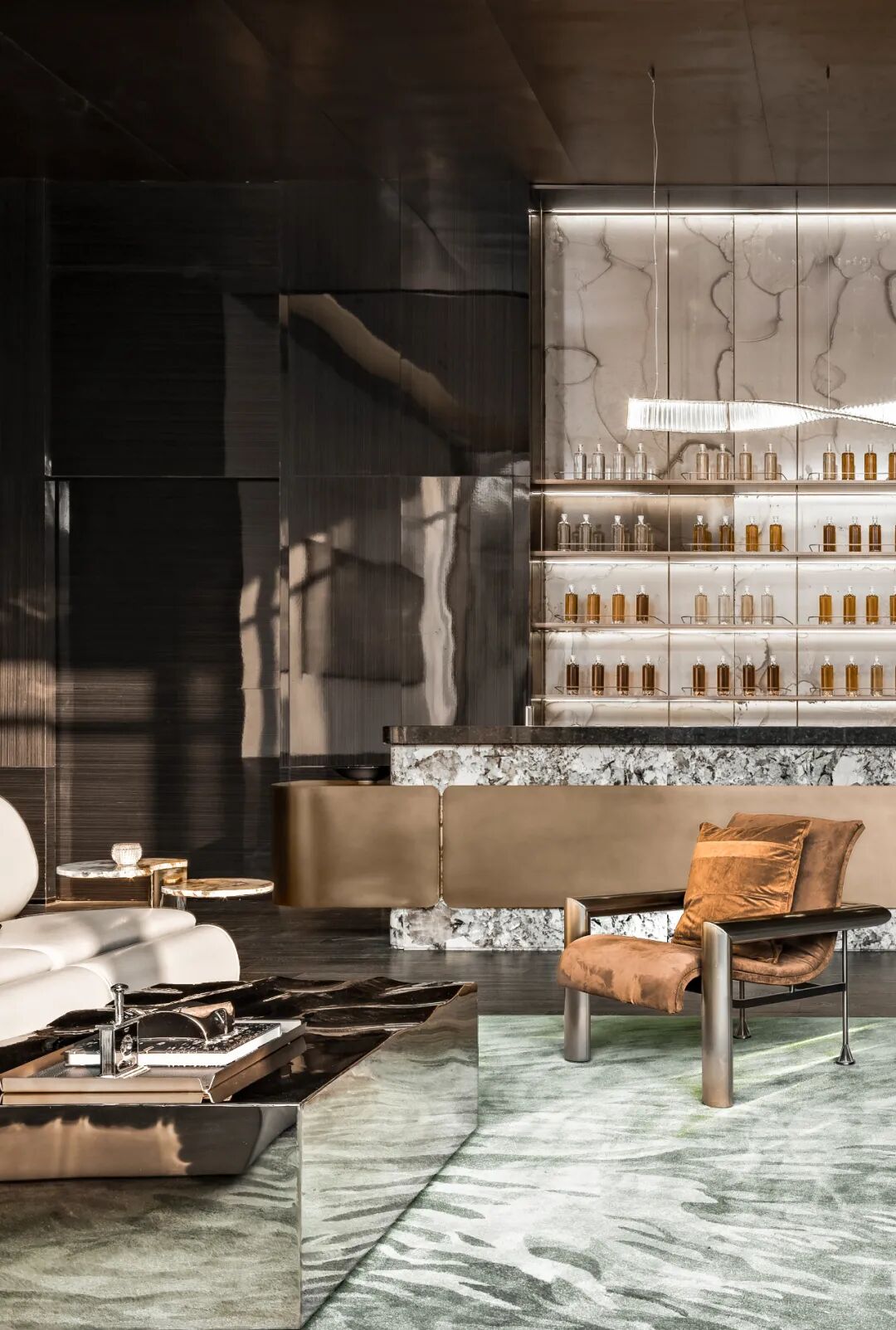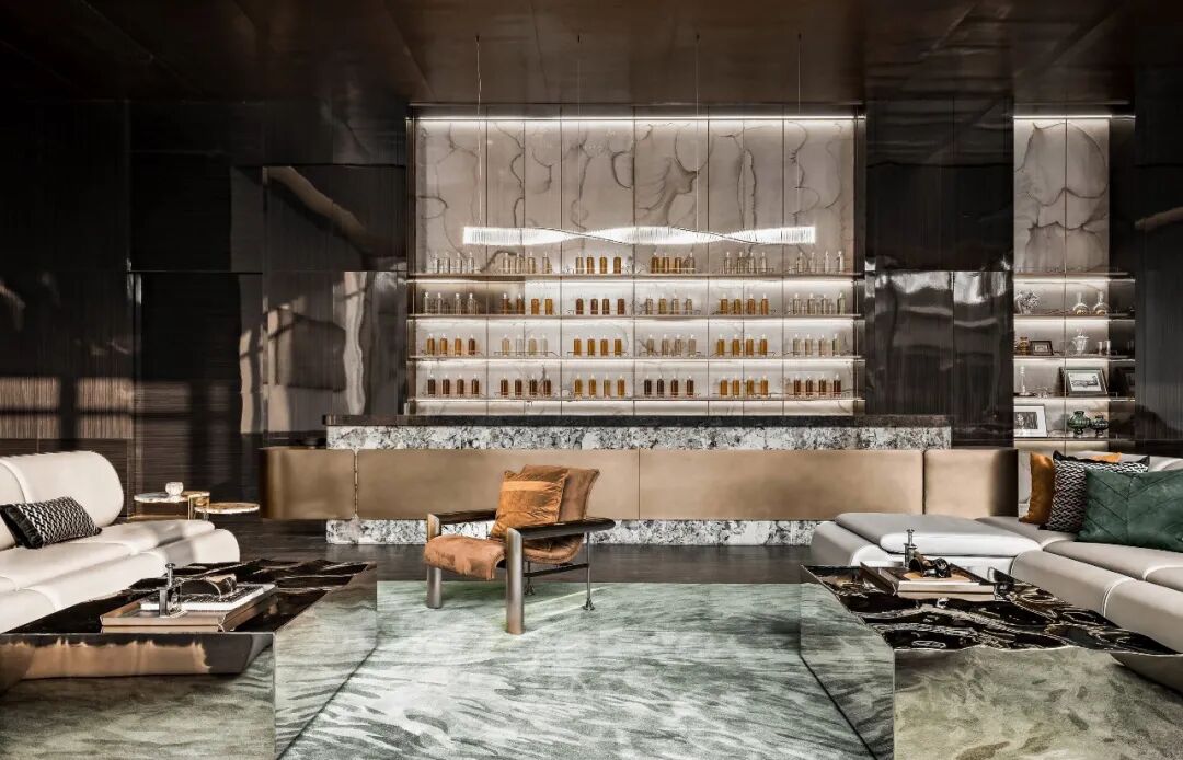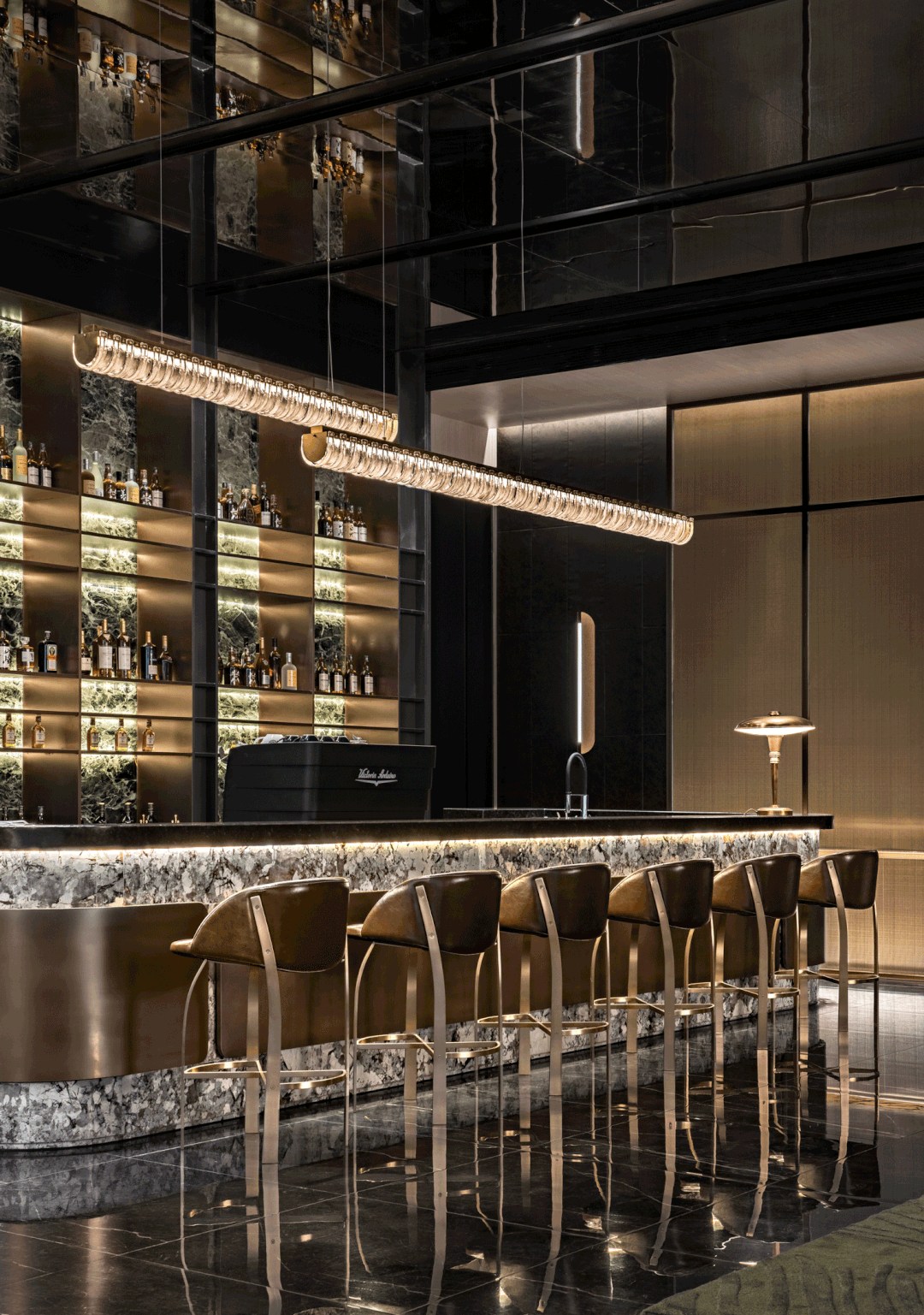 多功能水吧区是“茶文化”与“酒文化”的碰撞,搭配流光四溢的灯光、冰裂纹的大理石和深色的木饰面,让人能感受“黄金时代”的风情。这里好像装满了意大利城市的日光,阳光倾洒进来,空气洋溢着意式度假风情浪漫与雅致。