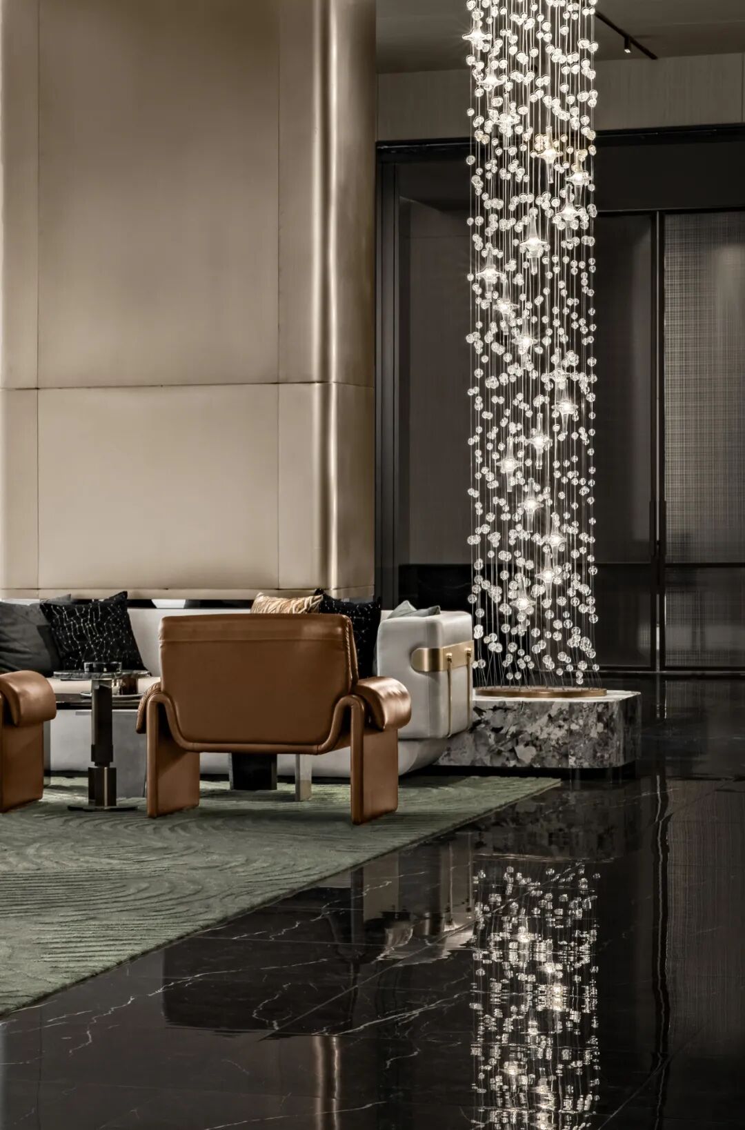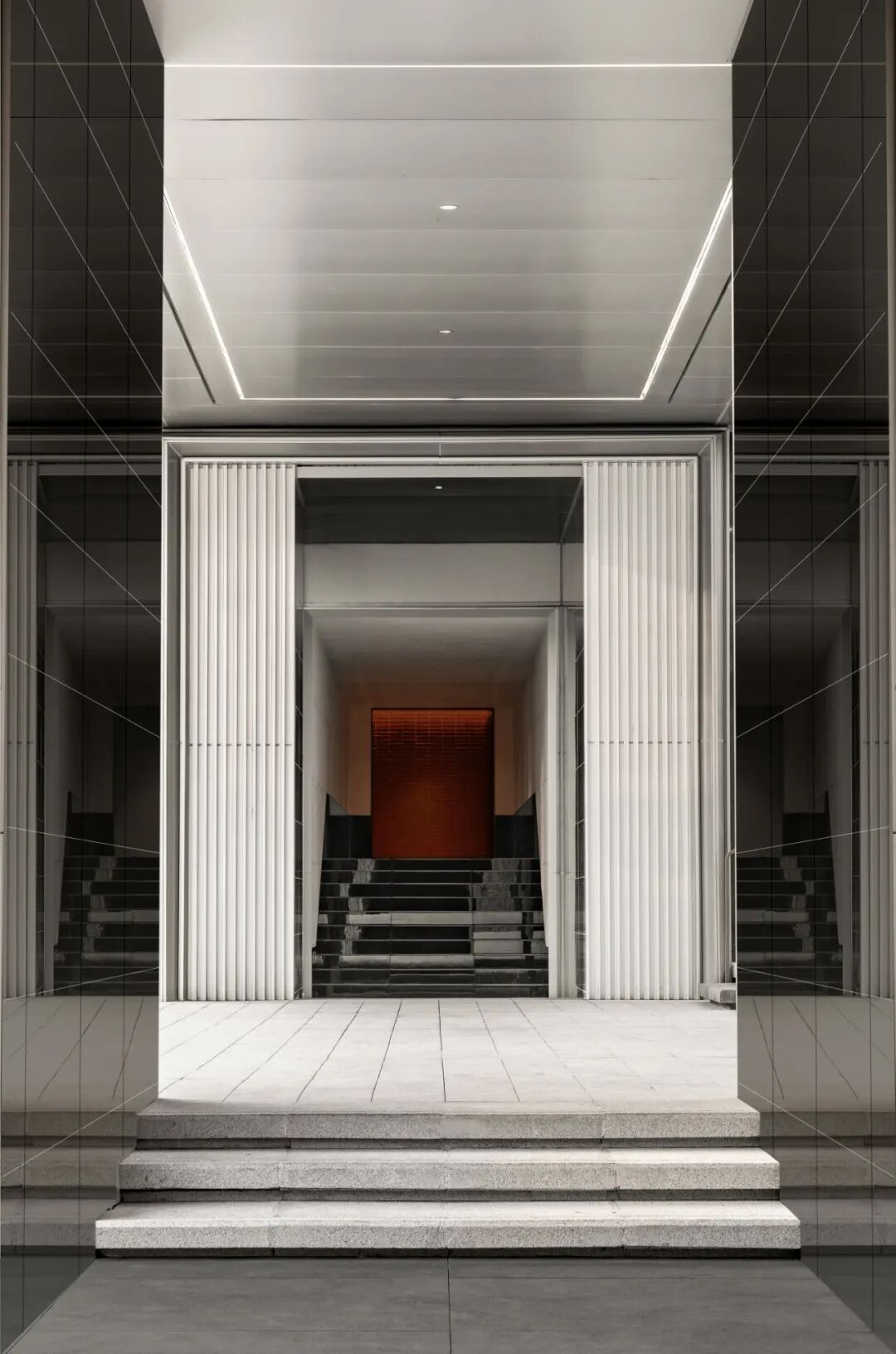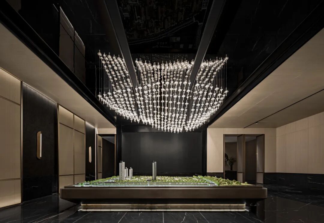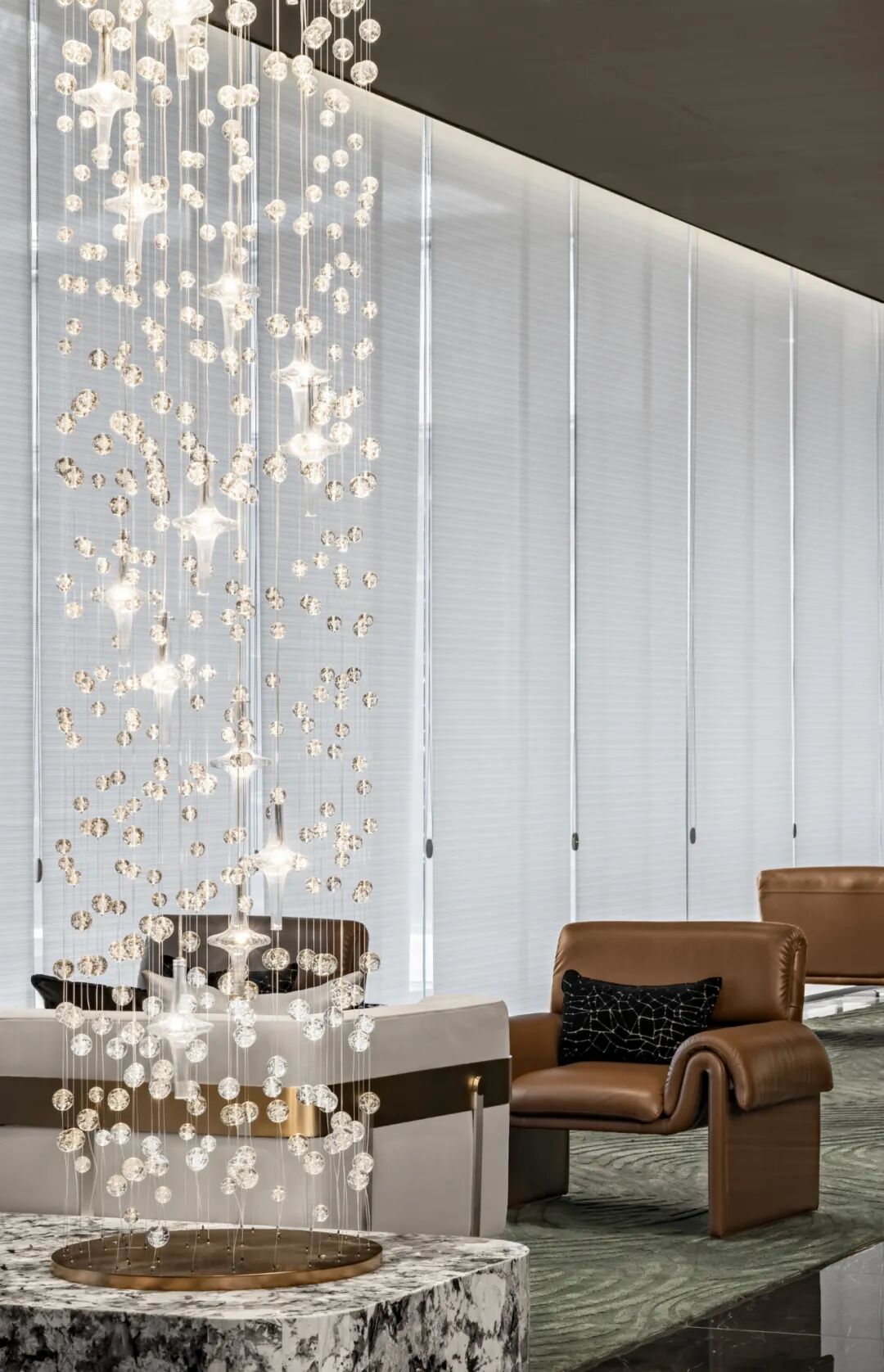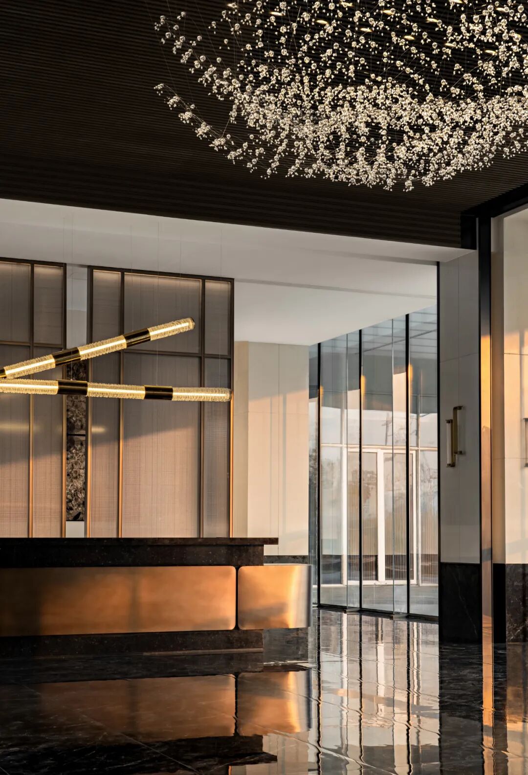 镜面天花延伸了视觉感受,结合方正的序列组合,带来强烈的秩序感和仪式感。由珠宝衍化而来的水晶灯成为了视觉的焦点,珠宝璀璨自信的能量从空间蔓延开来。