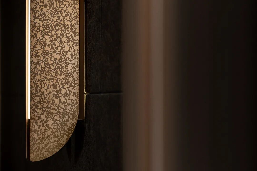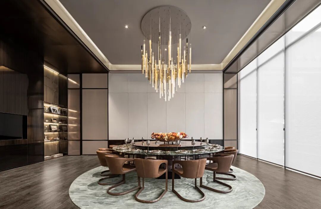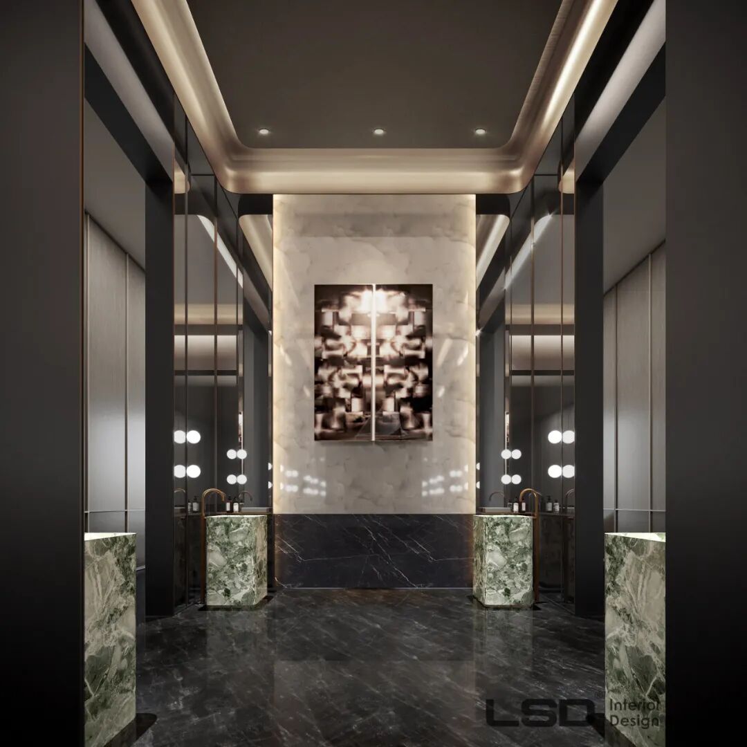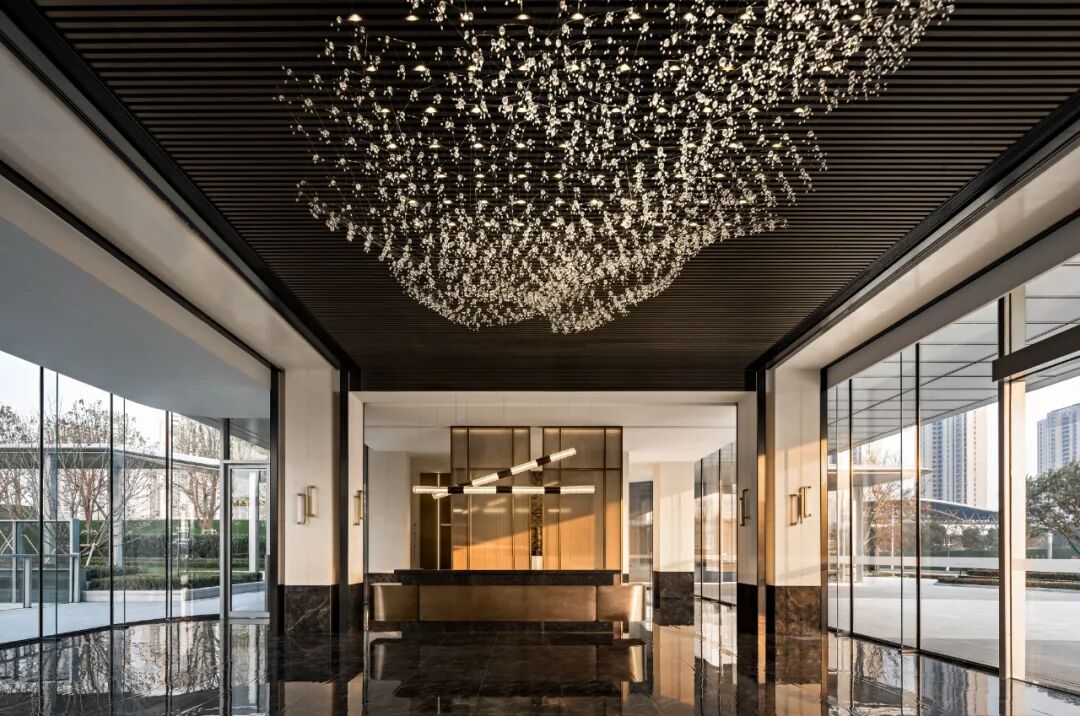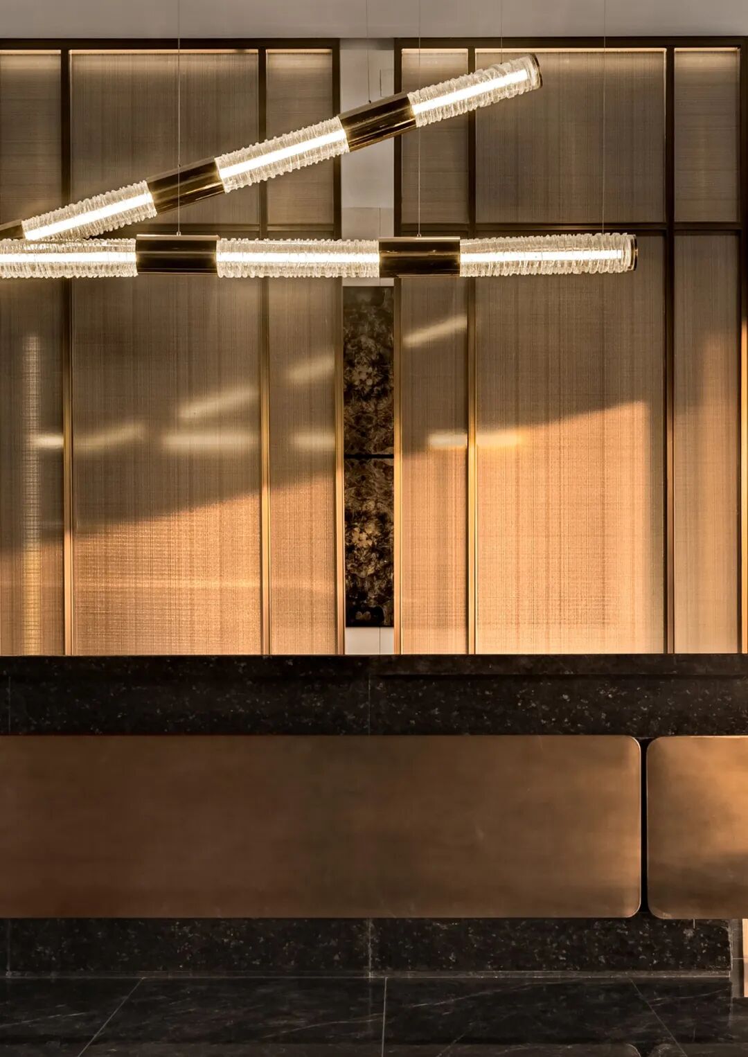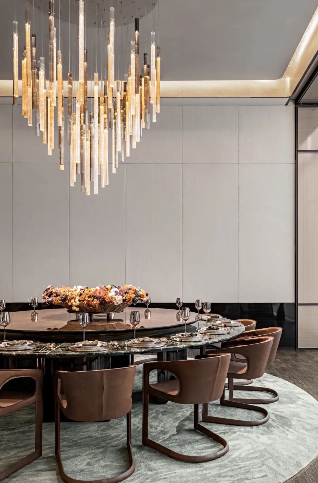 镜面天花延伸了视觉感受,结合方正的序列组合,带来强烈的秩序感和仪式感。由珠宝衍化而来的水晶灯成为了视觉的焦点,珠宝璀璨自信的能量从空间蔓延开来。