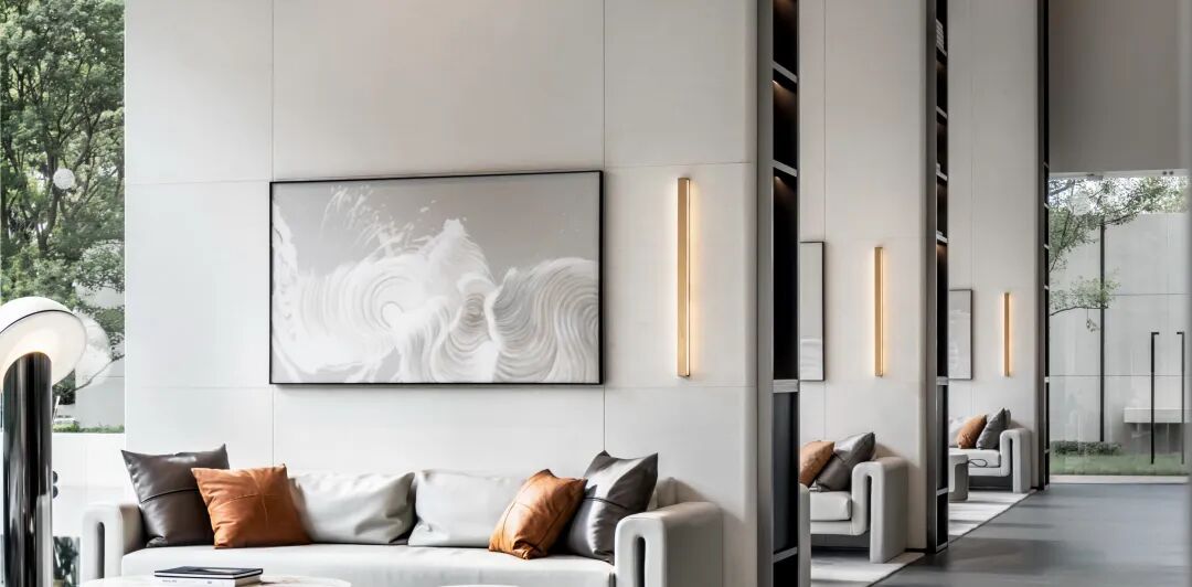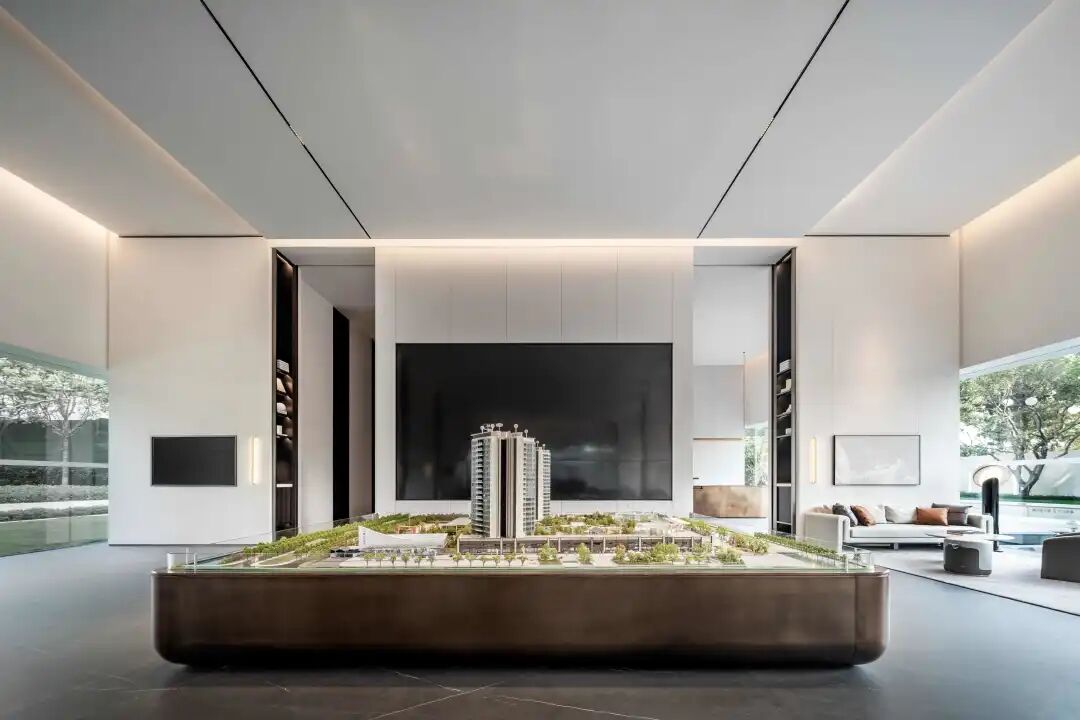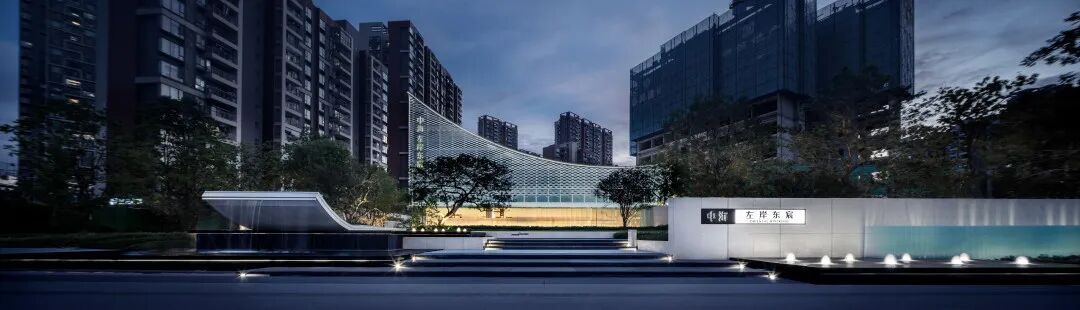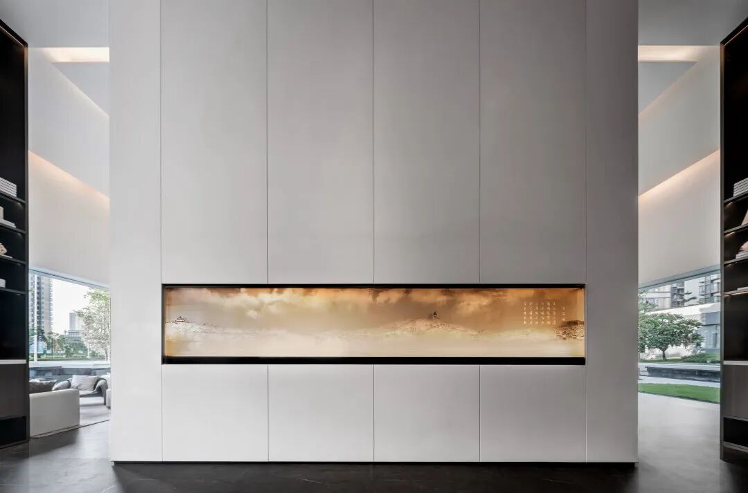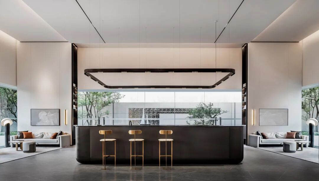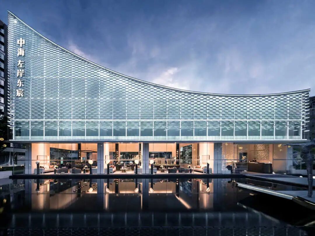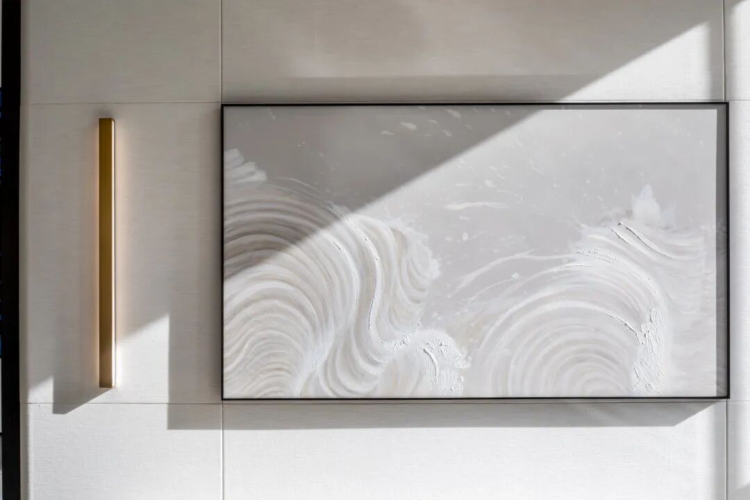 现代风格的基础上,提取自然之境的元素。夕阳西下的倒影、波光粼粼的水面、东江水浪的律动,解构自然的纯粹与静谧,进行不同角度的编排重组,营造东方雅致的人文之美。