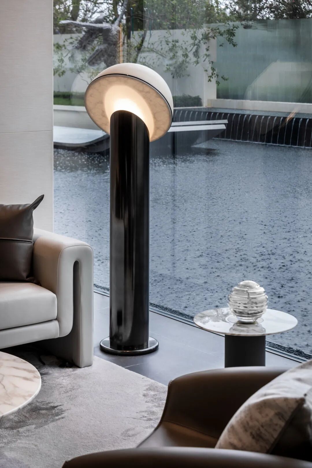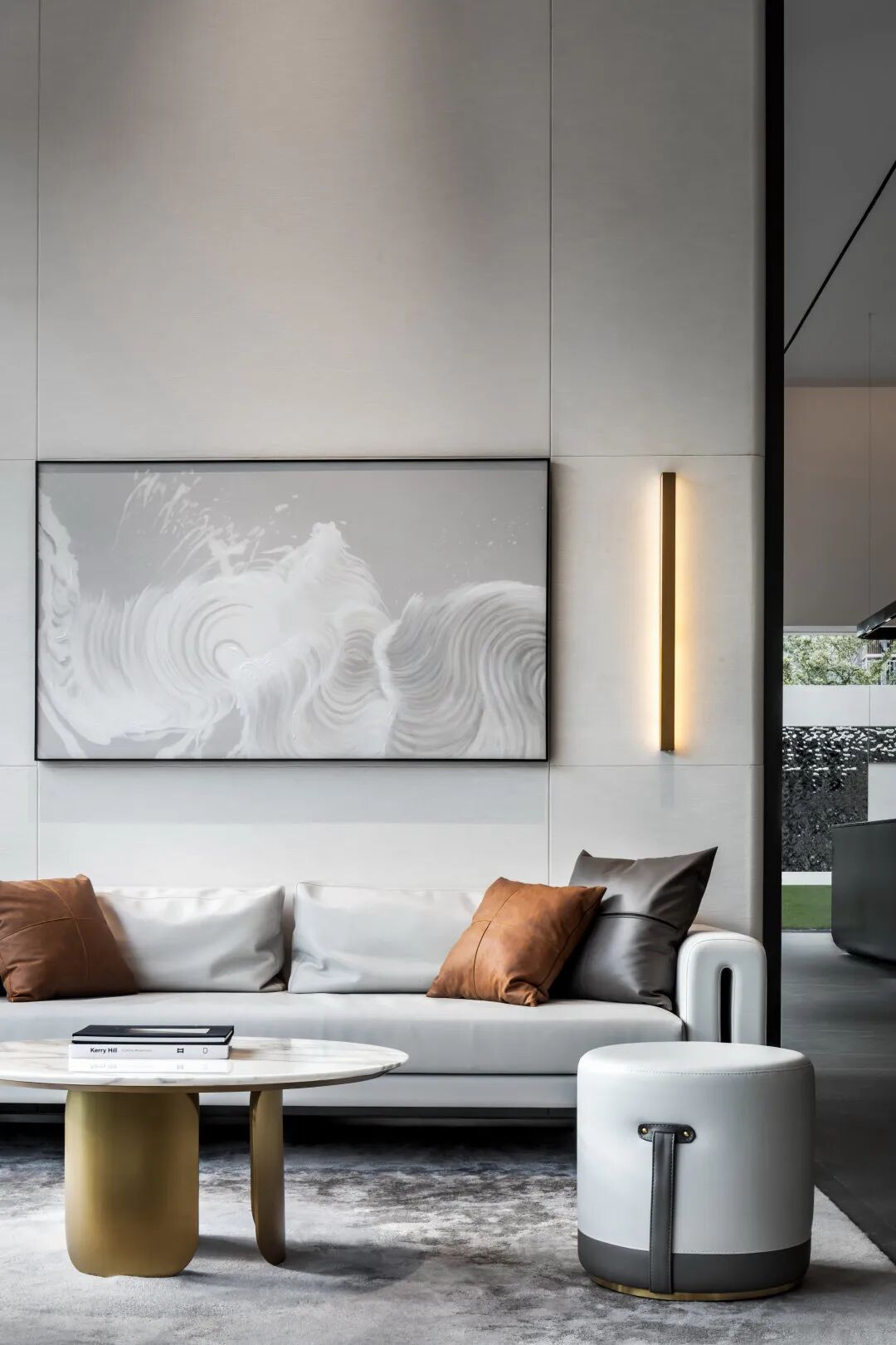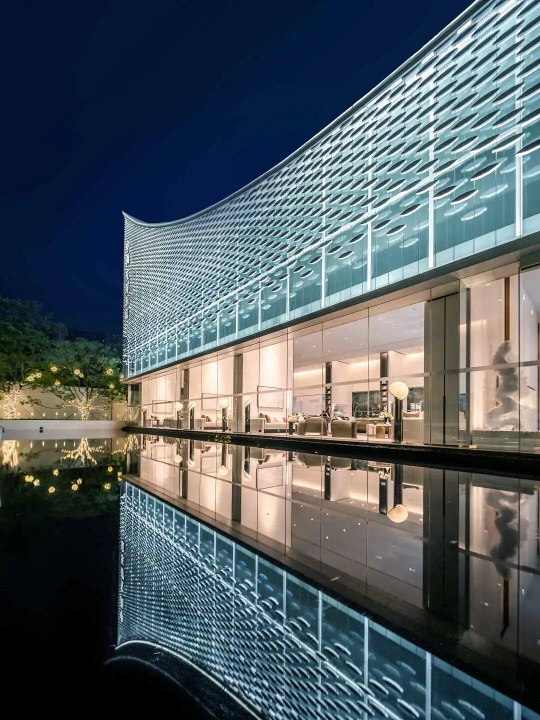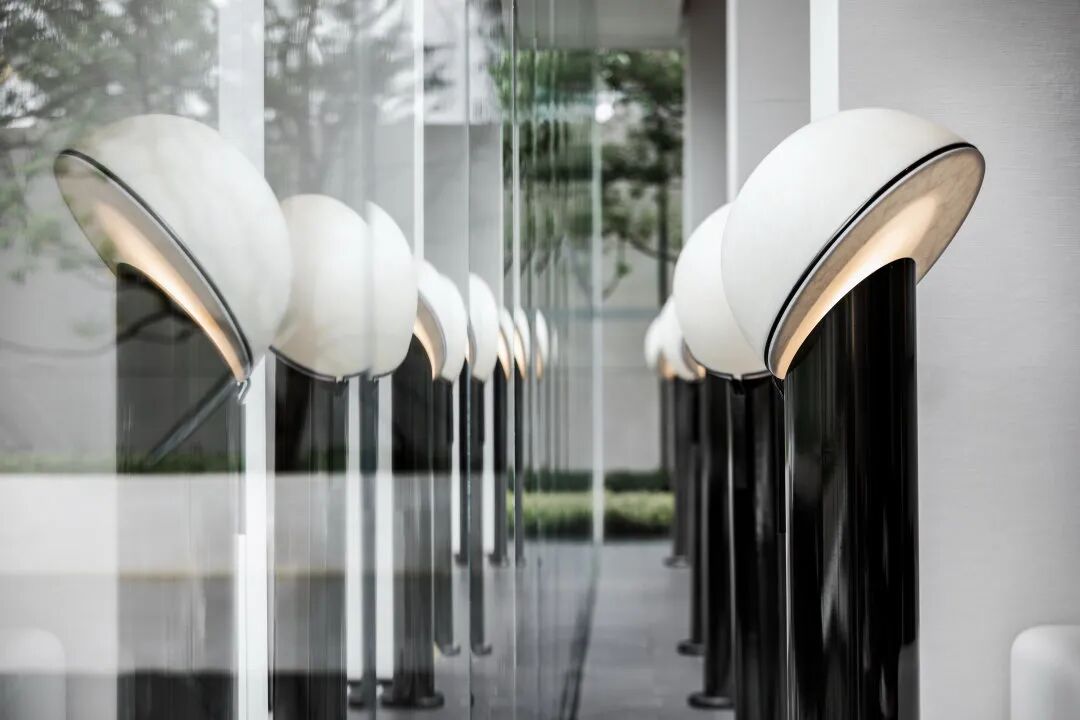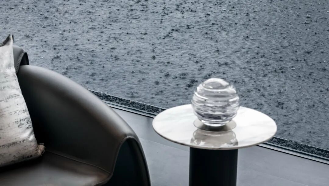 现代风格的基础上,提取自然之境的元素。夕阳西下的倒影、波光粼粼的水面、东江水浪的律动,解构自然的纯粹与静谧,进行不同角度的编排重组,营造东方雅致的人文之美。