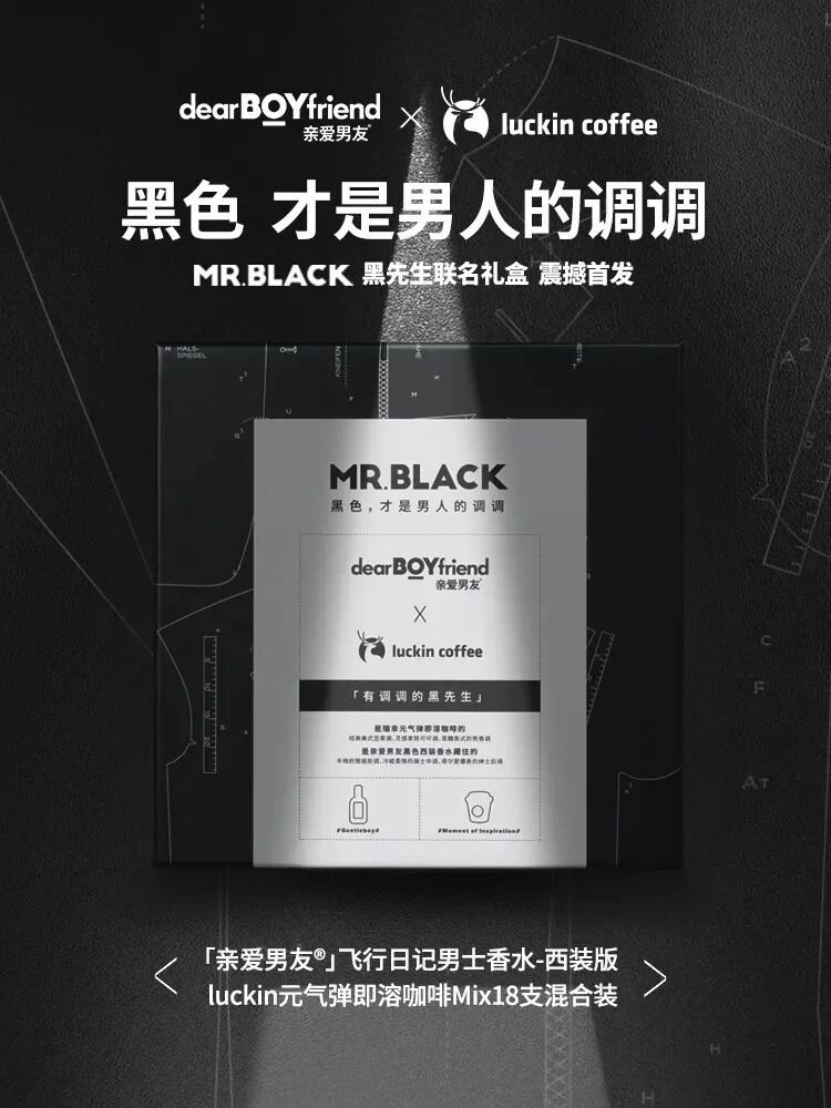 男士理容品牌dearBOYfriend亲爱男友近日与咖啡品牌luckin瑞幸咖啡携手推出“Mr.Black 黑先生”限定礼盒,礼盒包含亲爱男友飞行日记香水西装版与瑞幸元气弹即溶咖啡混合装两款产品。用黑色彰显出男性格调,从气味出发,将迷人格调从嗅觉延伸到味觉。(来源:官方微信公众号)