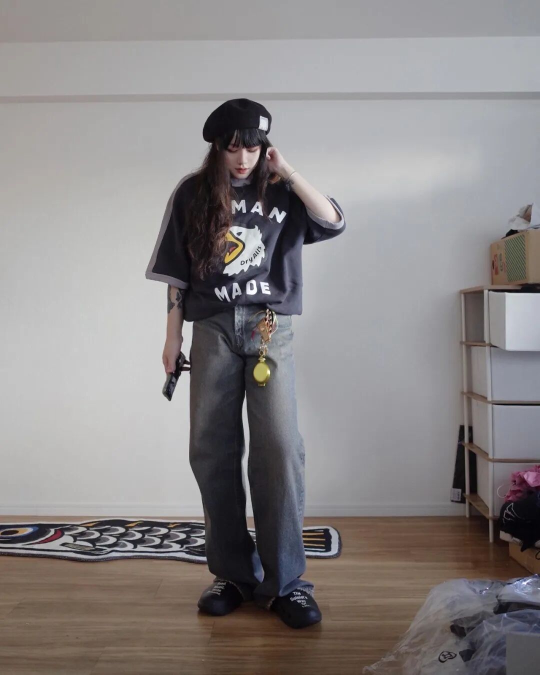 原来一个品牌有那么多文化,一条牛仔裤也有那么多裤型。后来在他们的鼓励下,我开始做WTAPS的女生工装穿搭,一开始也不知道这些衣服怎么搭配,但是我心里想的是我绝对不要套公式,也不想千篇一律。比如工装就一定要穿NEWBALANCE吗?至今我一双都没买过,而且我不喜欢太跨太宽松的感觉。慢慢的,我开始看日本潮流杂志,我觉得适合自己的身材的衣服才是最好的,不喜欢墨守成规的那种