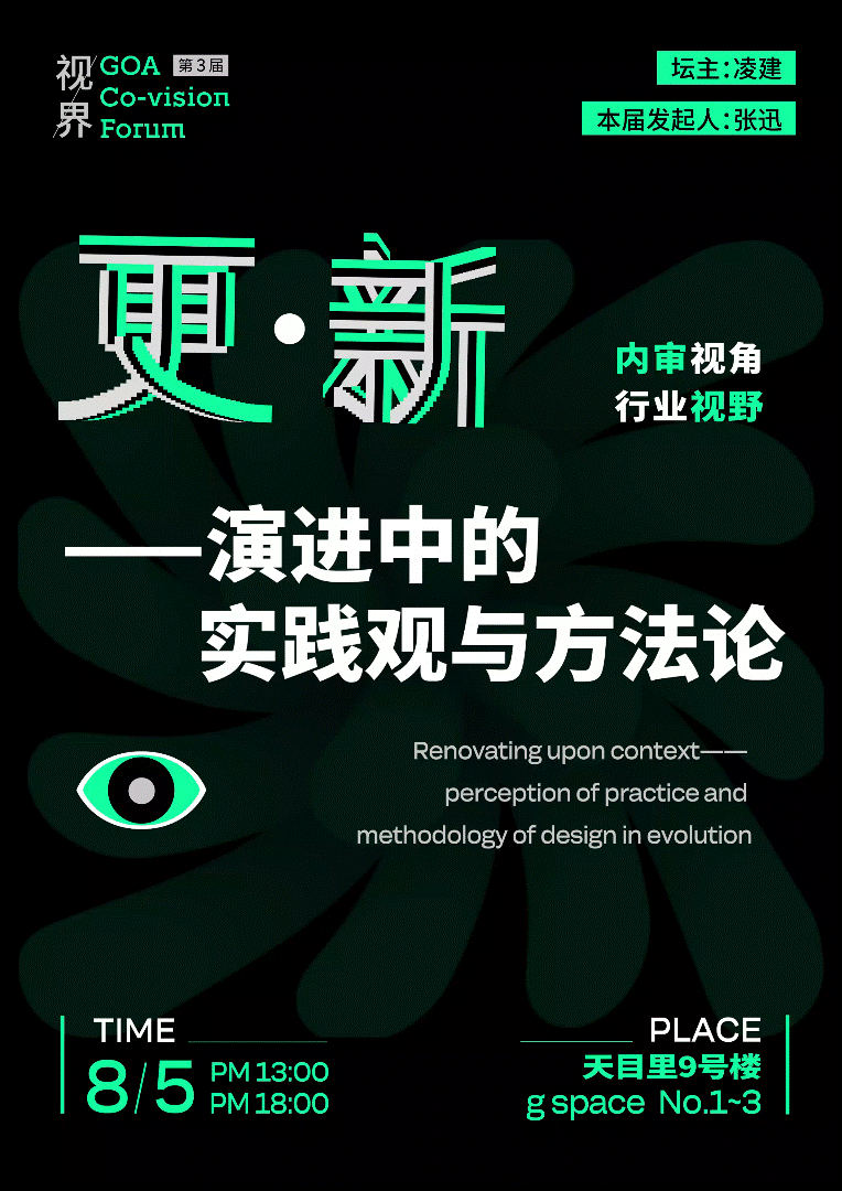 8月,第三届“goa视 · 界”论坛在goa大象设计隆重举行。本届论坛主题为“更·新——演进中的实践观与方法论”,旨在以goa设计实践为基础,激励内向审视与行业洞察,推动方法总结和现实思辨。主题展览同期开幕,goa大象设计2020-2022期间创作近80个实践项目于8月-9月在杭州、上海两地展出。