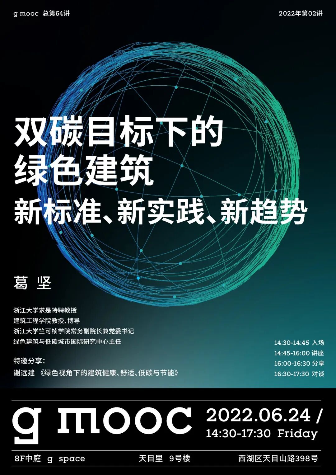 6月,g mooc 系列公开课第64讲于goa大象设计总部8F g space开讲。讲座围绕“双碳目标下的绿色建筑新标准、新实践、新趋势”展开。主讲嘉宾浙江大学求是特聘教授、建筑工程学院教授兼博导葛坚女士与特邀嘉宾朗绿科技创始合伙人、副总裁谢远建先生与我们分享各自在绿色建筑领域的深耕与实践。