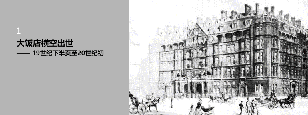 张晓晓:酒店设计和运营是我长期关注的领域。作为一种既有的商业类型,酒店早在上世纪六、七十年代就已发展成熟,如何在当下获得新的吸引力是一个值得探讨的话题。我想重新梳理酒店发展的历史轨迹,从中寻找一些启发。真正意义上的大饭店出现于19世纪下半叶到20世纪初,工业革命推动了汽车的普及,以王室和富豪为主的消费群体也应运而生,一战至二战时期,商务型酒店长足发展,标志性人物埃尔斯沃斯·施塔特勒推动了客房产品、酒店服务、运营法则的标准化体系建立,二战后大量知名连锁品牌崛起,热带度假酒店相继出现;80年代,精品酒店的概念问世,以mogans为先锋,时髦、精致、个性化的酒店体验赢得新的市场。