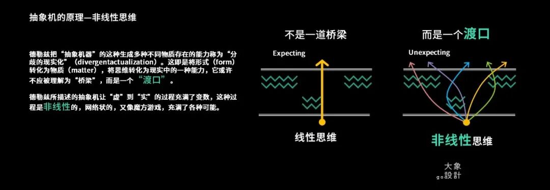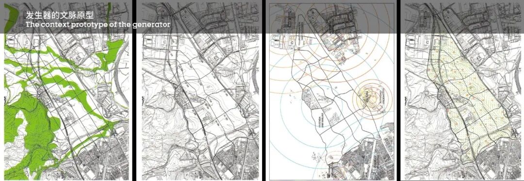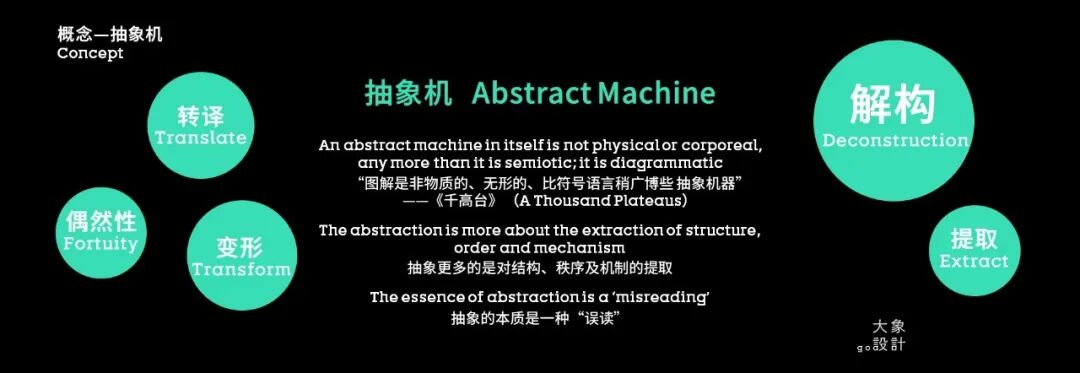 这两个概念常用于后现代哲学和方法论,对于我们的设计也具有启发性:前者像基因激发新的内容产生,后者带来思维方式的变化,它们共同作用推动了更新。两个概念启发了思维方式的变化,给予我们三种在不同的原型下的非线性思维:1、以图形为原型的转译 2、场所肌理文脉的转型 3、逻辑思维的几何变形。