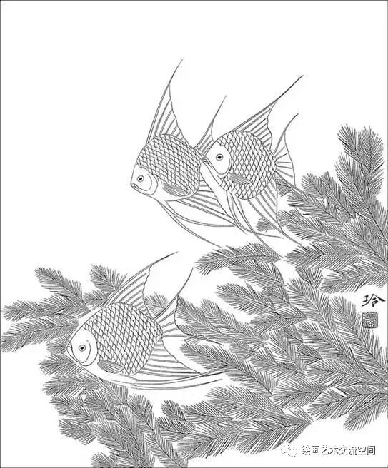 步骤一:勾线,燕鱼用淡墨勾,先勾外轮廓,再勾鱼鳞,线条要均匀细挺,墨色要统一。鱼稽和鱼尾的线条要流畅飘逸。勾线造型要准确,自然灵动。水草用中墨勾,要有飘逸感。