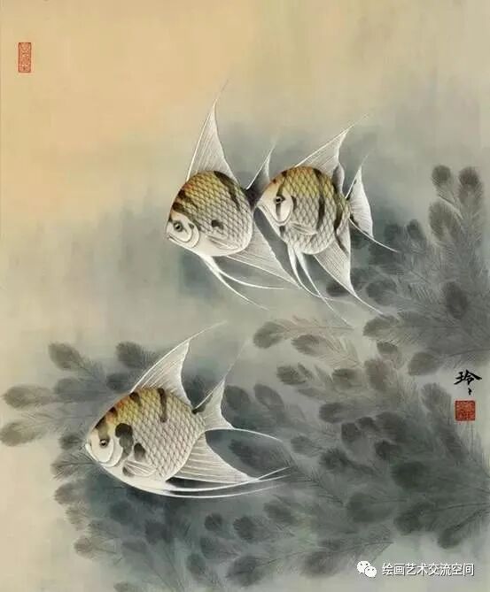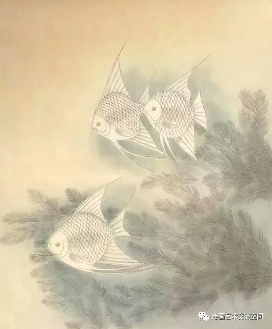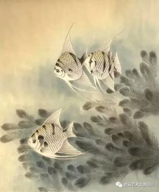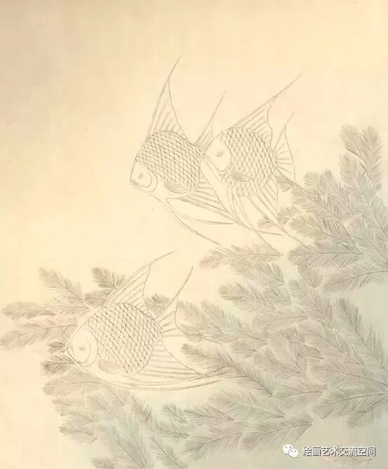 步骤五:水草用中墨分染。逐渐加深斑纹的墨色,斑纹墨色染足后,用淡藤黄多次罩染鱼头和背部。鱼周围要不断烘染淡花青,已达到烘托出燕鱼的效果。