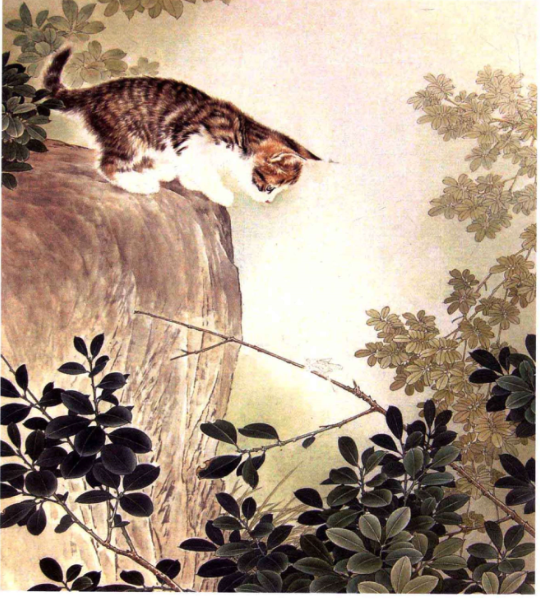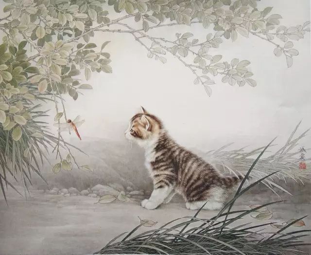 3、深入刻画,用尖锋笔蘸不同的墨色细化猫的各个部位。逐渐完善景物,调整近景、地面和中景的关系。景物完成后,在适当的位置画上蜻蜓。将猫刻画至无不妥之处后,再用白粉画须眉,然后落款、钤印,完成。