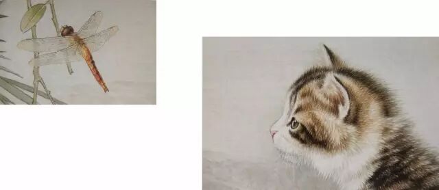 2、着色。勾染猫的眼睛、鼻子、耳朵并着色,多遍加重至八成,然后用散、扁锋笔蘸不同的墨色,反复丝毛,将皮毛颜色逐步深入。深色毛多用墨,浅色毛多用色,白色毛尽量不用墨,以保持毛色的纯度变化。
