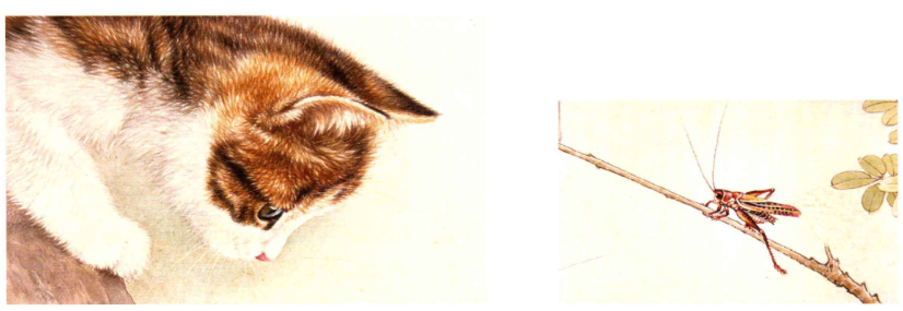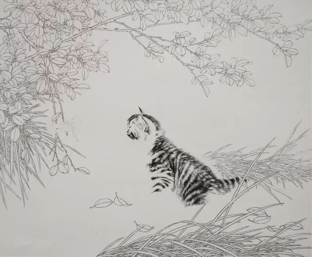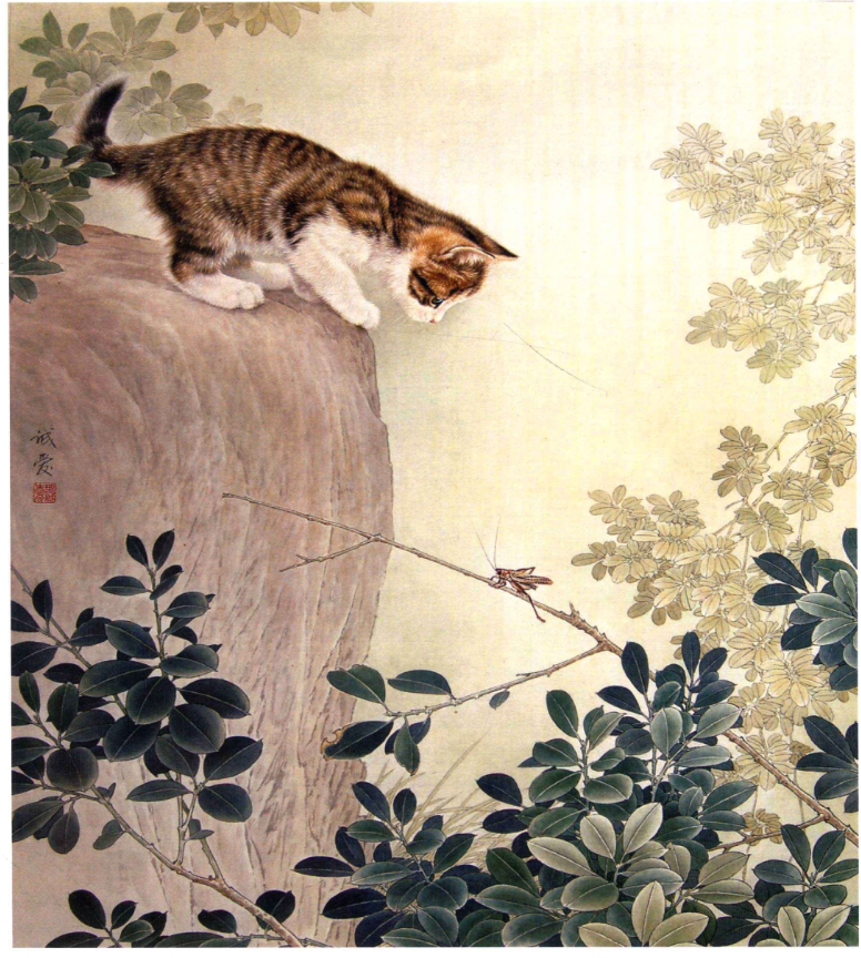 3、刻画细部。着重刻画猫的头部五官,交代每个细节的变化,使其更加生动夺目。调整了猫与景物的关系,将画面内的各个部分画到位,确认无不妥之处后,再用白粉画须眉,落款、钤印、完成。