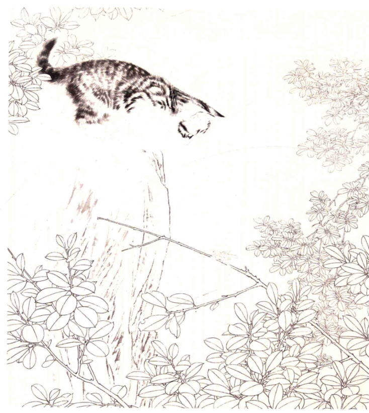 石头以墨为主,略加冷暖色。背景浅灰色上稍有冷暖变化,景物的空间虚实层次在协调中逐渐完善。再将猫用上述方法着色至八成。然后用类锋笔蘸各种不同的墨色进行细部刻画。