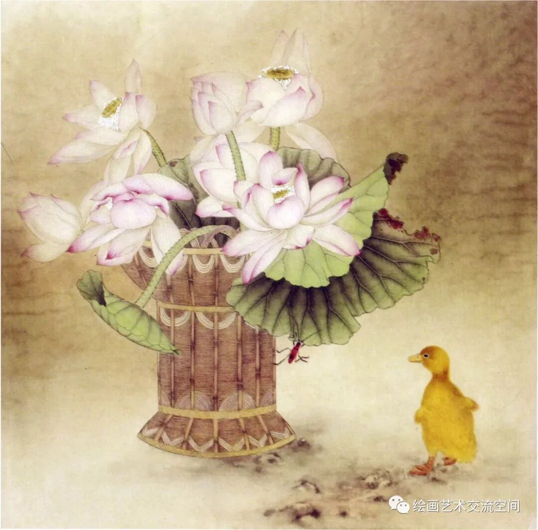 花篮平涂藤黄+朱磦。荷叶和梗继续用淡墨分染,留出叶筋。注意反叶稍浅。荷花花瓣平涂白粉,然后分染曙红。莲蓬用藤黄+朱磦+少量花青分染出结构。雏鸭平涂黄橙色,干后用稍深的黄橙色单笔丝毛,由浅到深,层层深入。鸭蹼用朱磦平涂,曙红分染,顺手把红天牛染出。