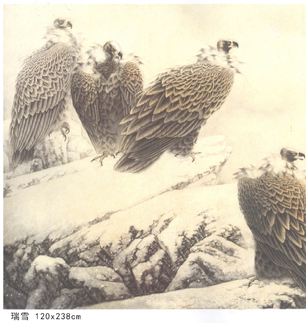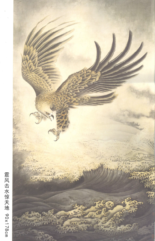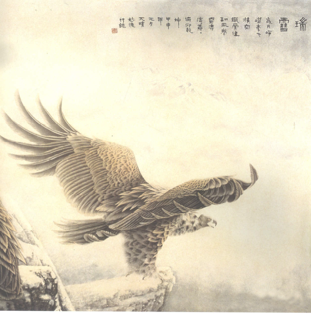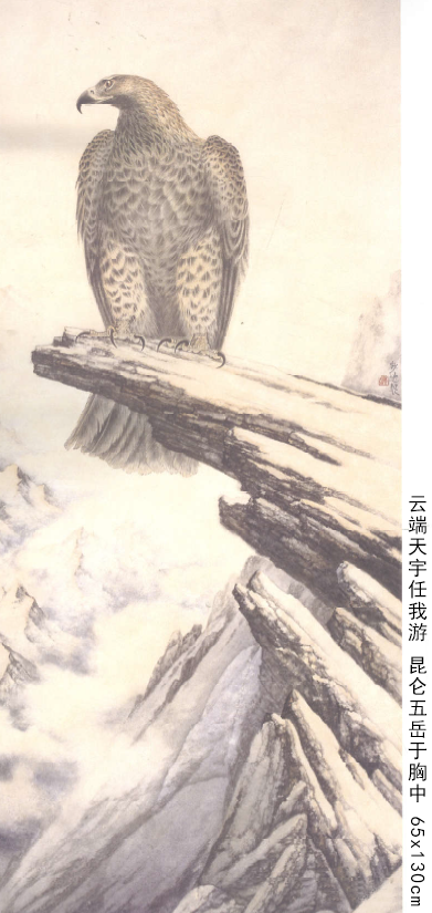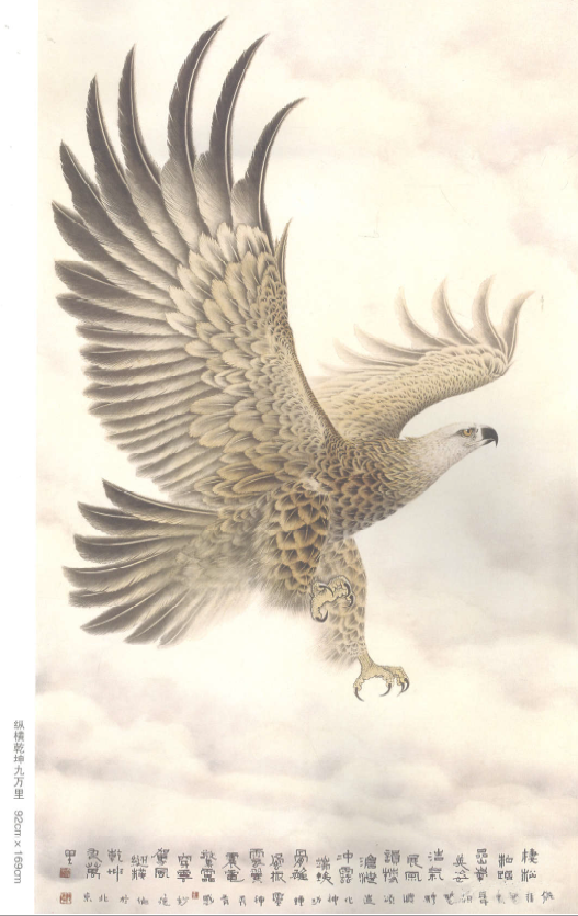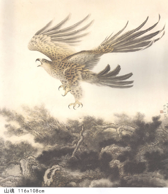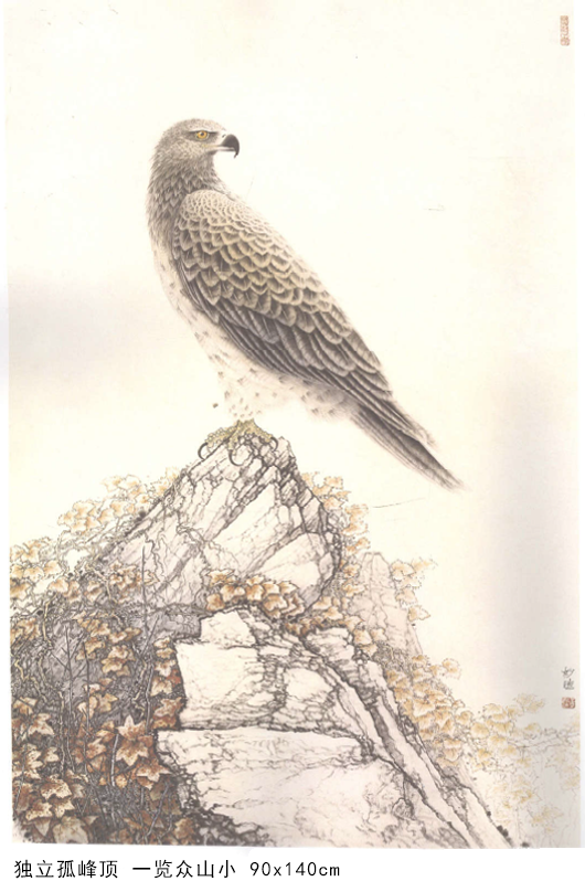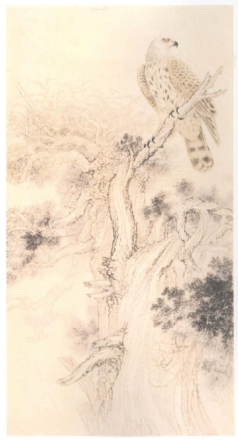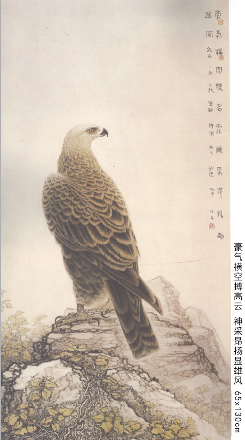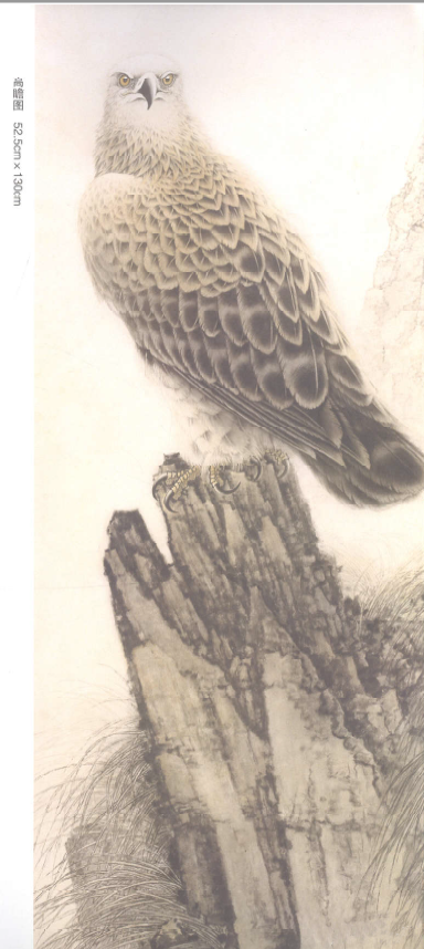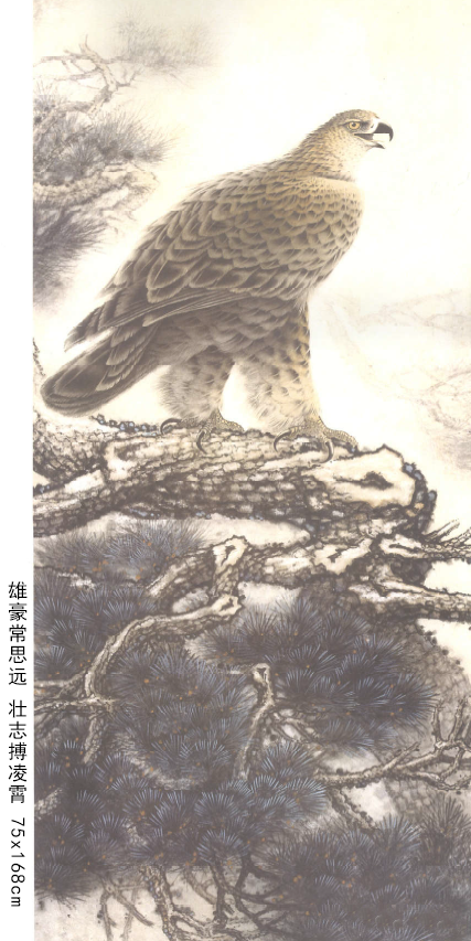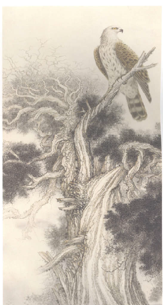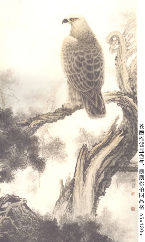 3.古柏的雄姿伟态和傲风抗雪的精神,是鹰品格的写照。中锋用笔,以线为主,笔意劲健,顿挫有致,刚柔并用,笔笔生发,显现出苍古浑朴、顽强的生命力。鹰的丝毛,笔笔有路,秩序严谨,不混乱、不板滞,加强翅膀和尾部的晕染及眼睛、勾喙、利爪的刻画。