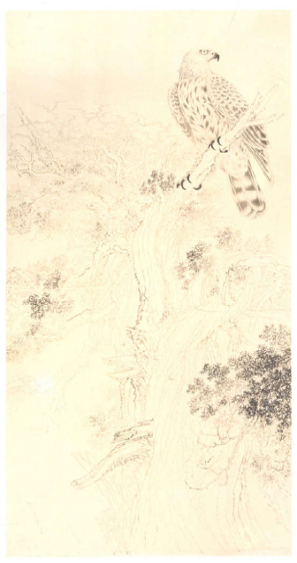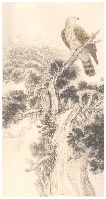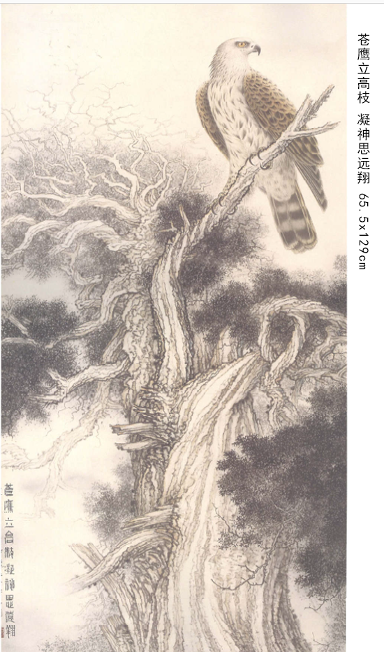 2.在前幅勾墨线初步构成画面的基础上,骨法用笔,一波三折,进一步刻画古柏主杆的纹路肌理枝杈的伸展穿插,用浓淡墨进行皴、擦、勾,以及团团点叶,簇簇虚实,疏密枯润,前后近远还有笔记墨趣的处理。注意鹰的丝毛,羽毛走向和整体的和谐,把初步意图,用笔加以表现。
