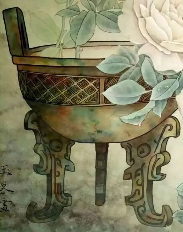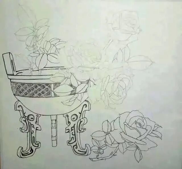 鼎,浓墨勾,线条粗点,勾出青铜器的挺拔刚健感,红花重墨勾,浅色花淡墨勾,叶重墨勾,虚叶淡墨勾。