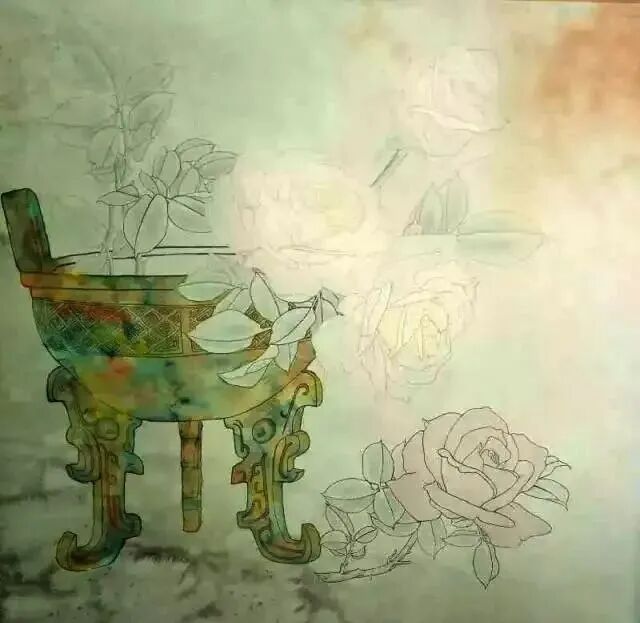 绿色刷底,多刷几遍,后鼎下角用墨刷并用清水冲出肌理,刷底时在不干前洗出浅色花,花上角用硃磦加点墨染,这样上角成暖色调,花青高染法染叶,鼎用湿染法,酞青蓝,赭石,三绿,藤黄,分别染鼎,使以上四种色在鼎上相互交融。