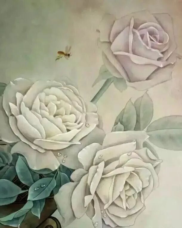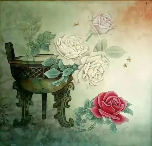 用浓淡墨分别染鼎,染好后复勾鼎上的线。红花用牡丹红染,后加微量墨深入,花边牡丹红加白提亮,白花用赭石加黄和微量墨画,后用墨青染外圈花,花朵用牡丹红加太青兰染,叶用墨青深入后罩绿色,写意画法画出蜜蜂,鼎下角为使画面稳定继续刷墨和绿色。